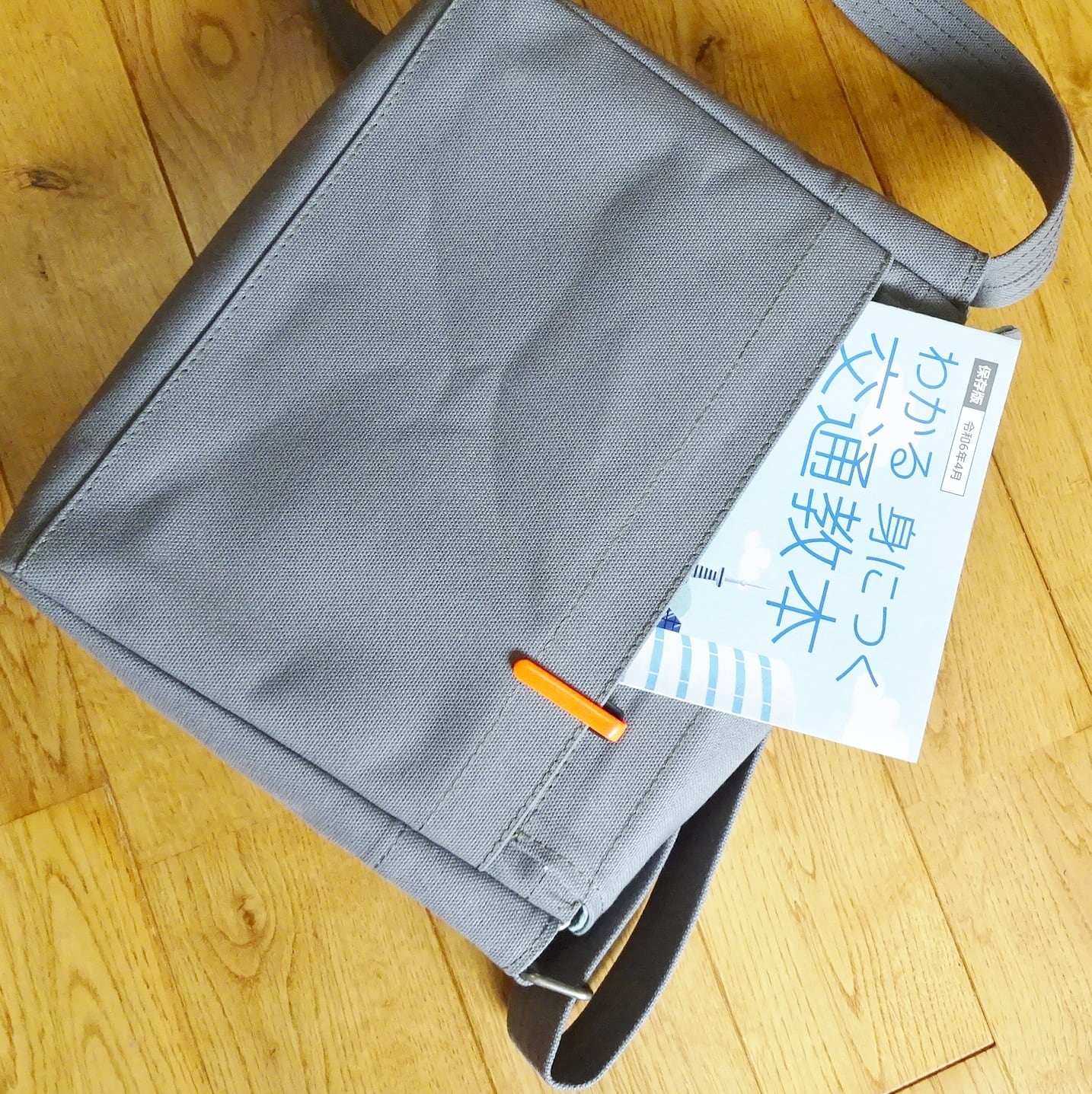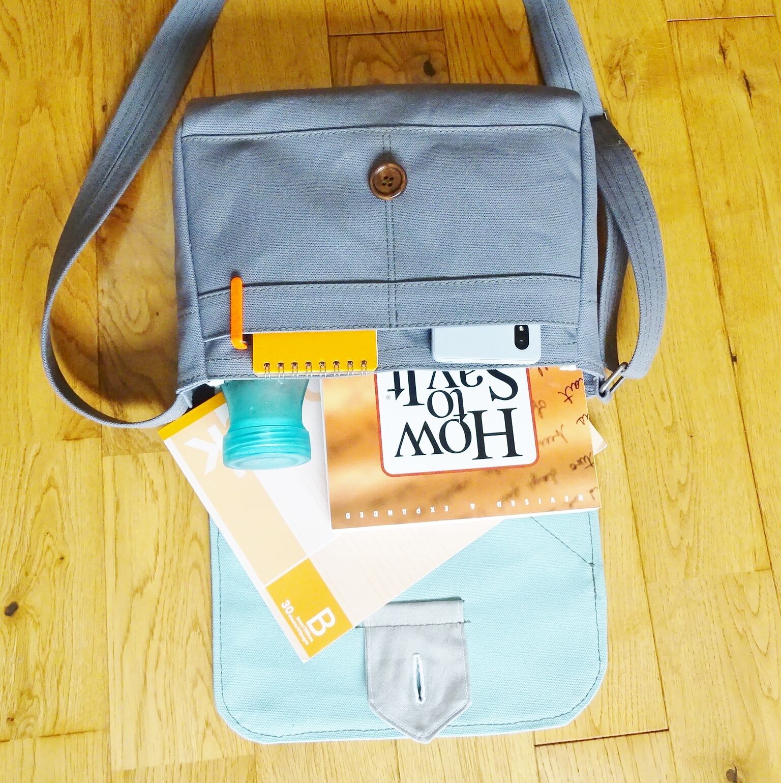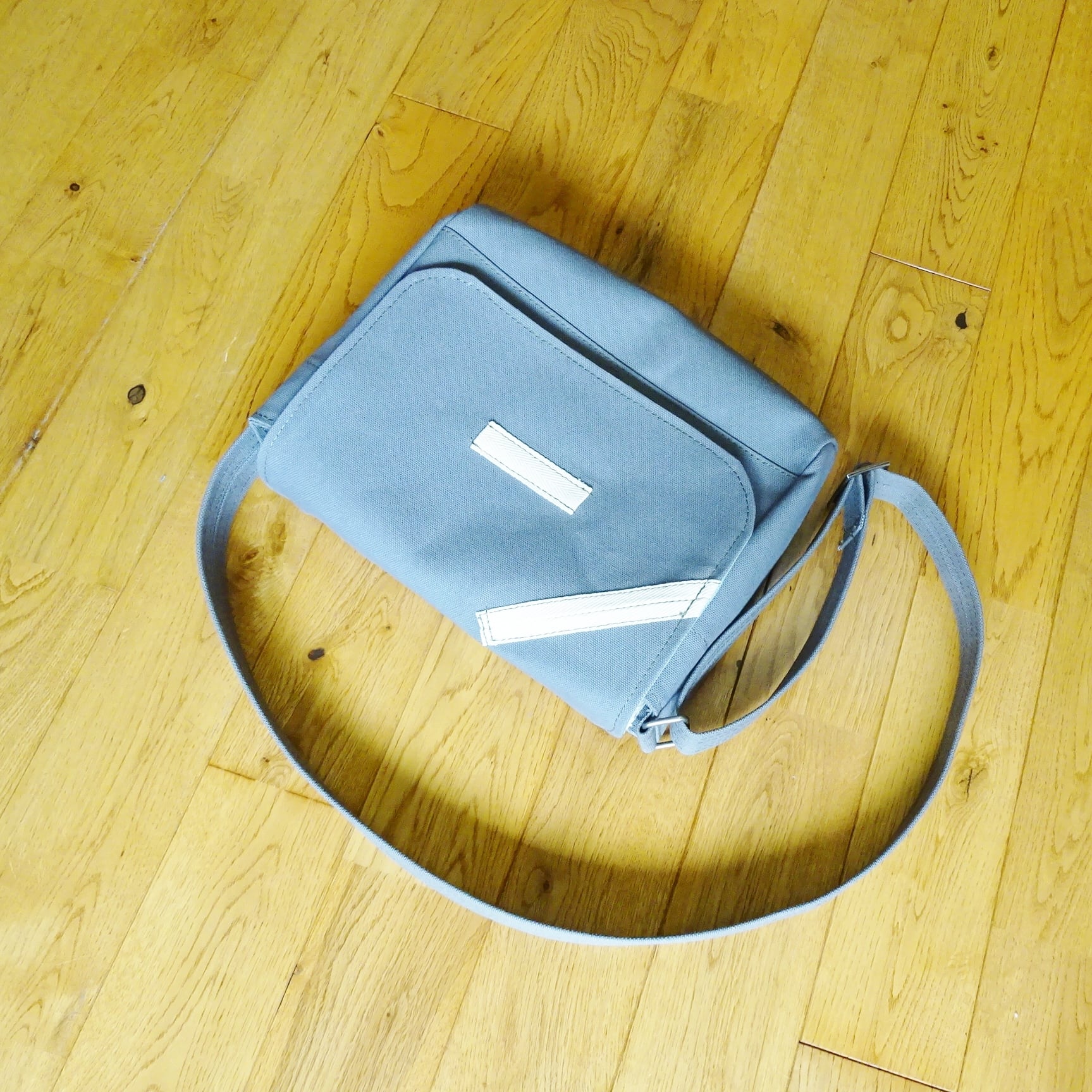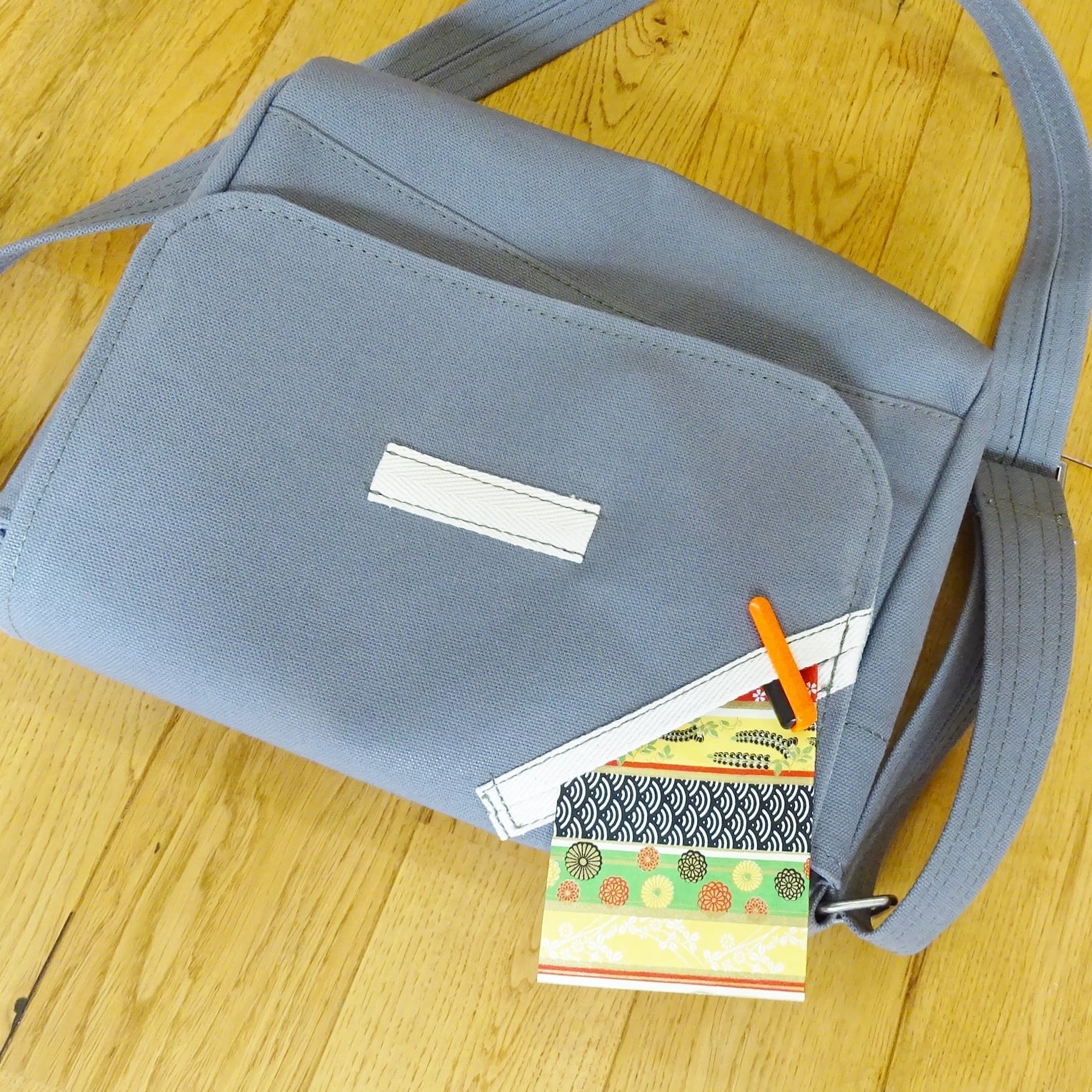 ■使用材:本体 フラップ ストラップ 8号帆布グレー、フラップ裏 8号帆布生ミントグリーン、縁テープ 綿綾テープ20mm生成り、縫糸 20番ポリエステルスパン糸オリーブ色、木製ボタン