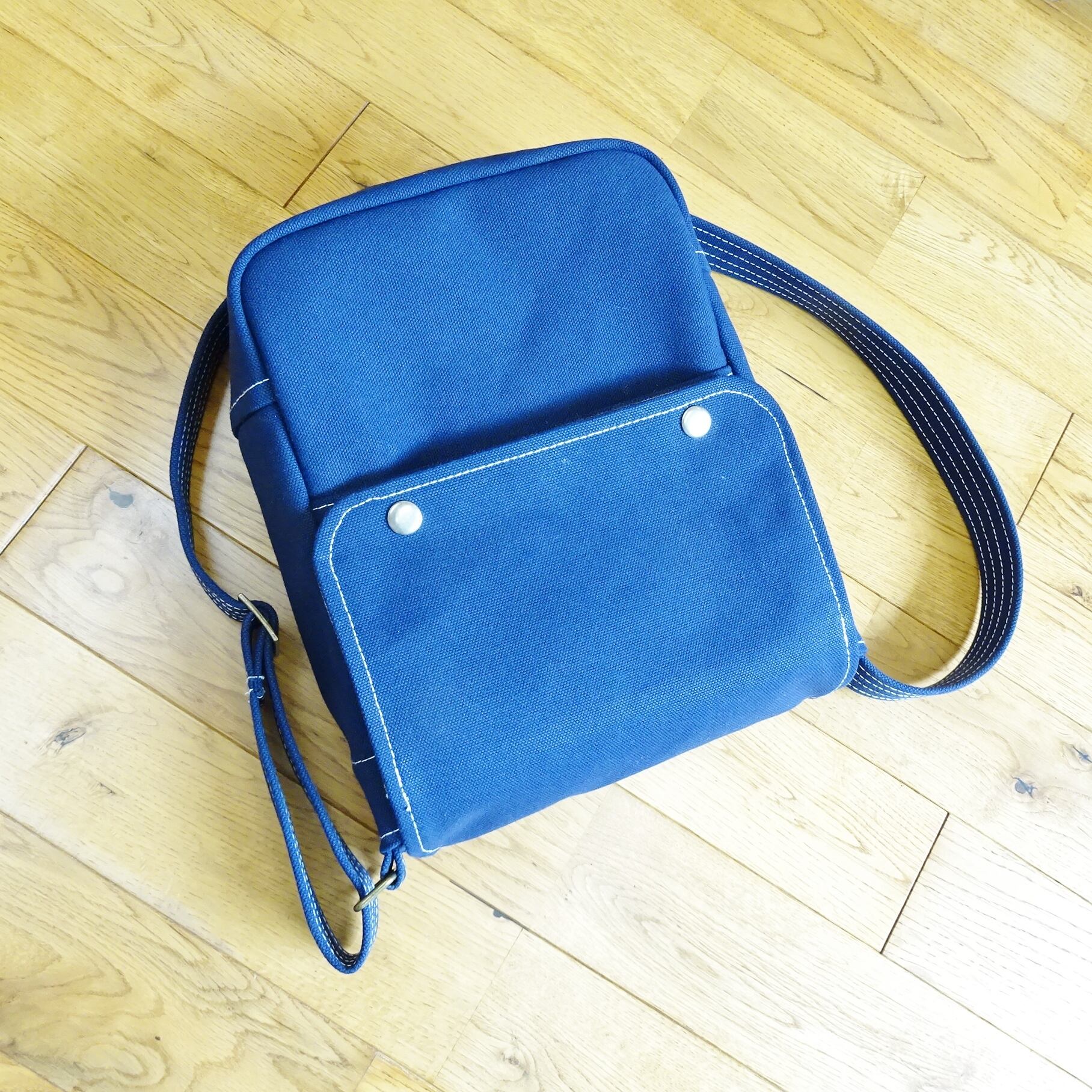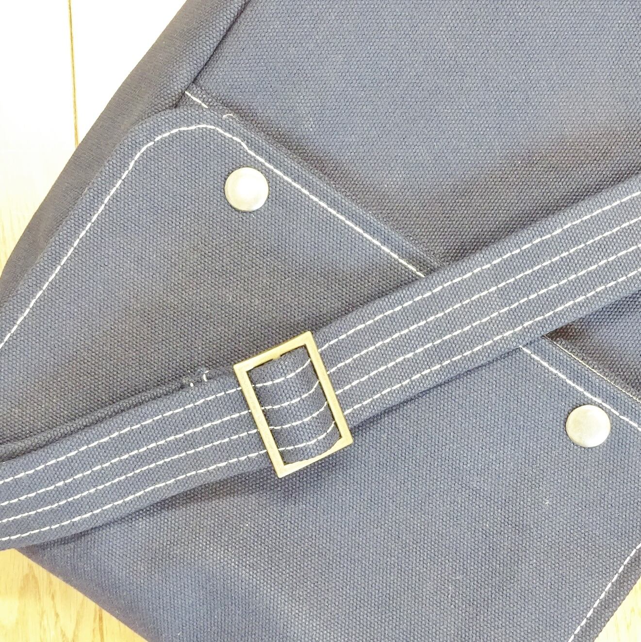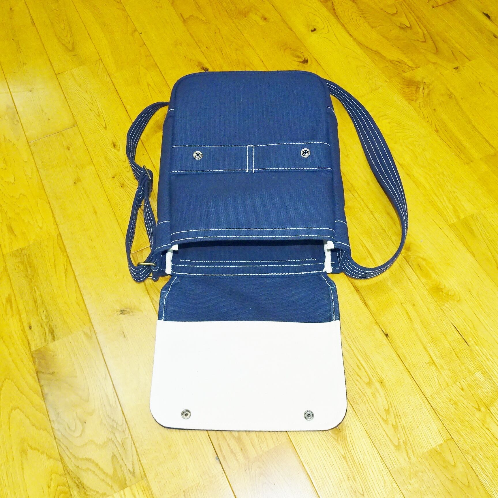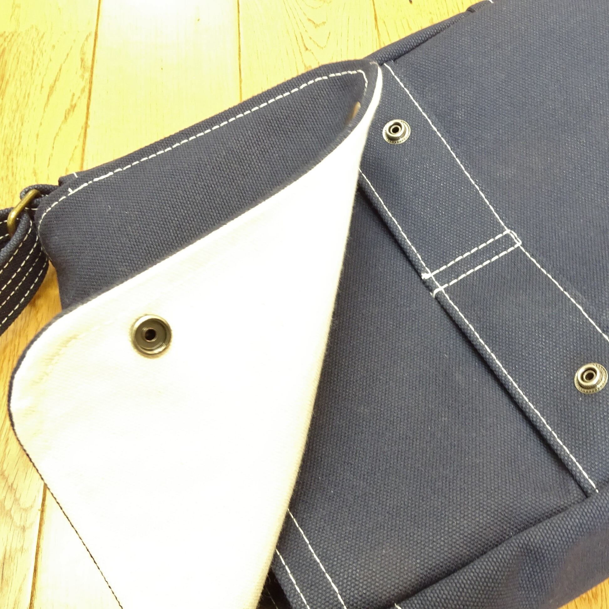 ■使用材:本体・ストラップ 6号帆布生 紺色、フラップ裏 8号帆布生成り、縁テープ 綿綾テープ20mm生成り、縫糸 20番ポリエステルスパン糸、スプリングホックボタン
