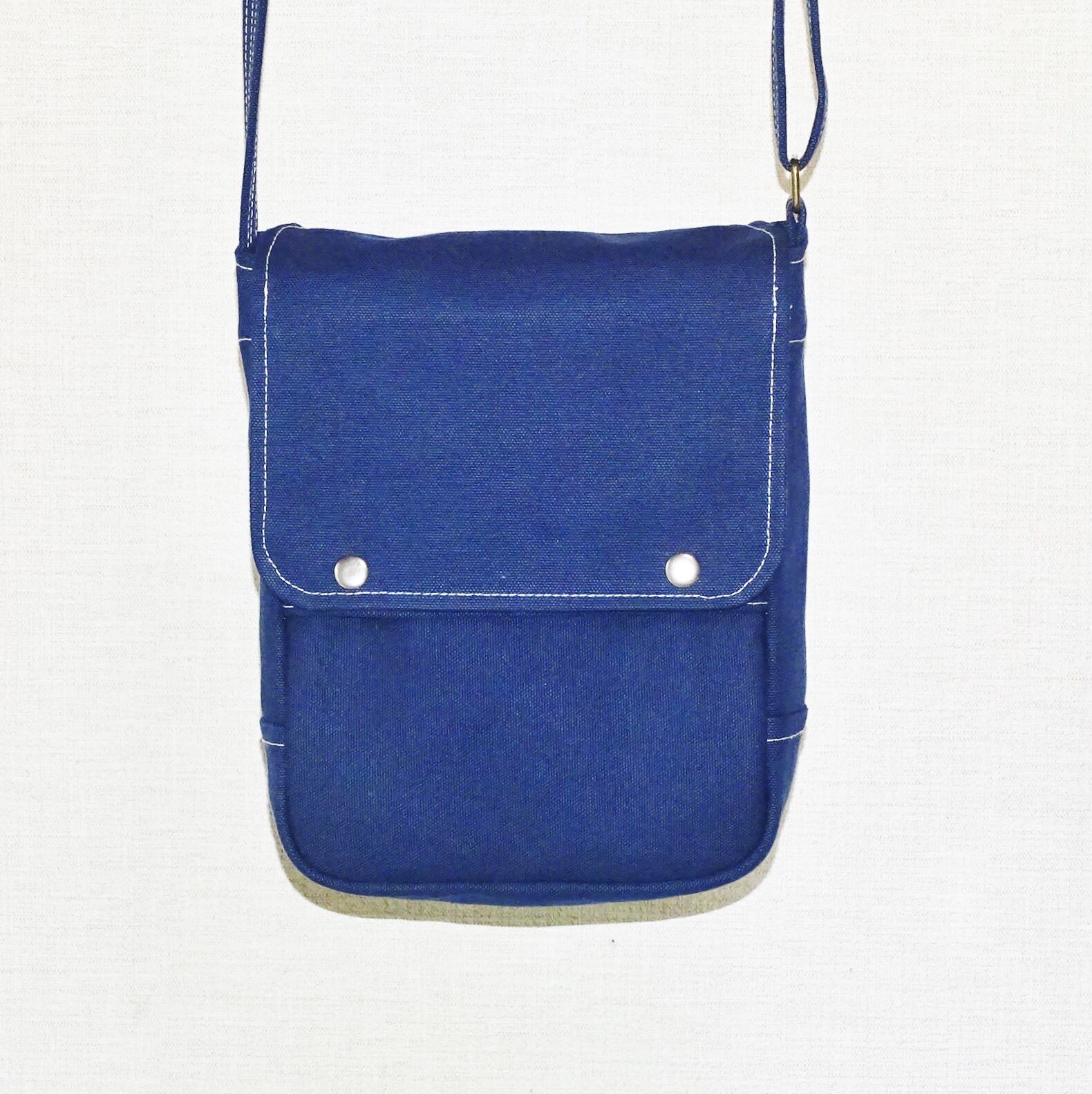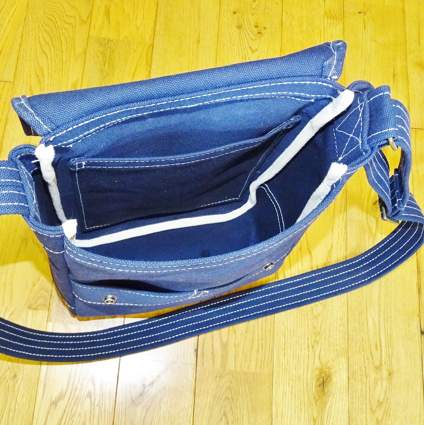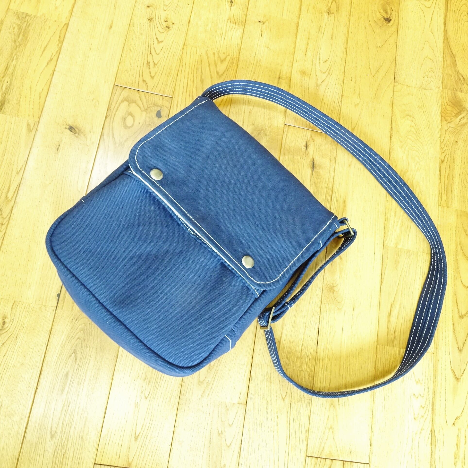 ■使用材:本体・ストラップ 6号帆布生 紺色、フラップ裏 8号帆布生成り、縁テープ 綿綾テープ20mm生成り、縫糸 20番ポリエステルスパン糸、スプリングホックボタン