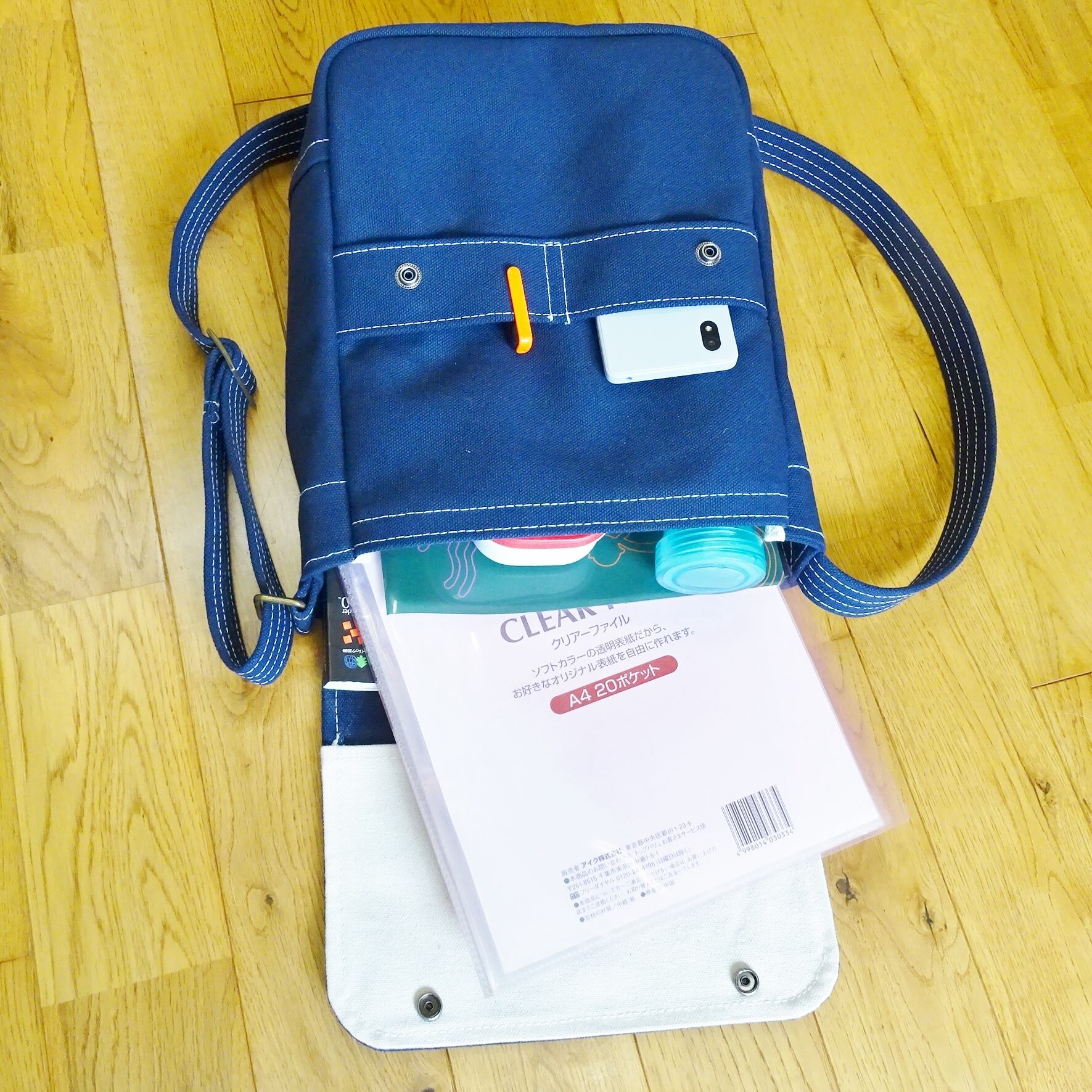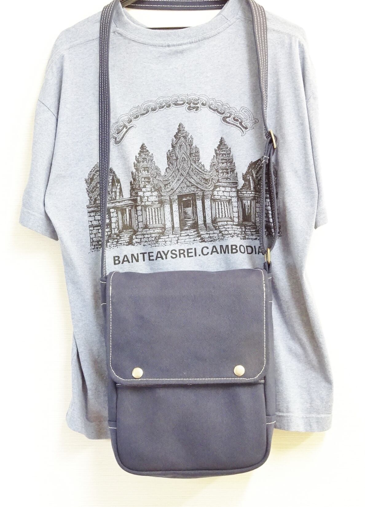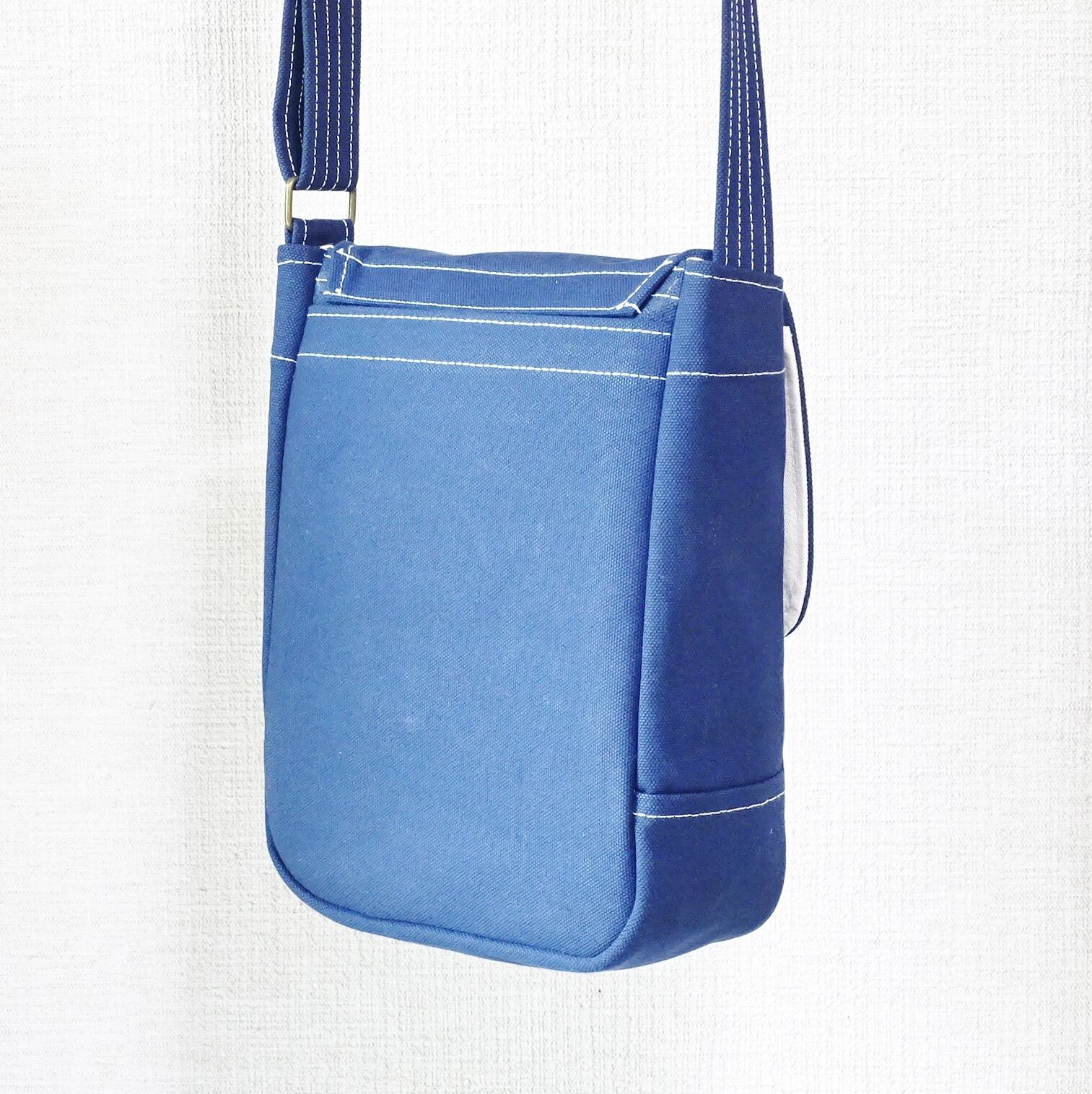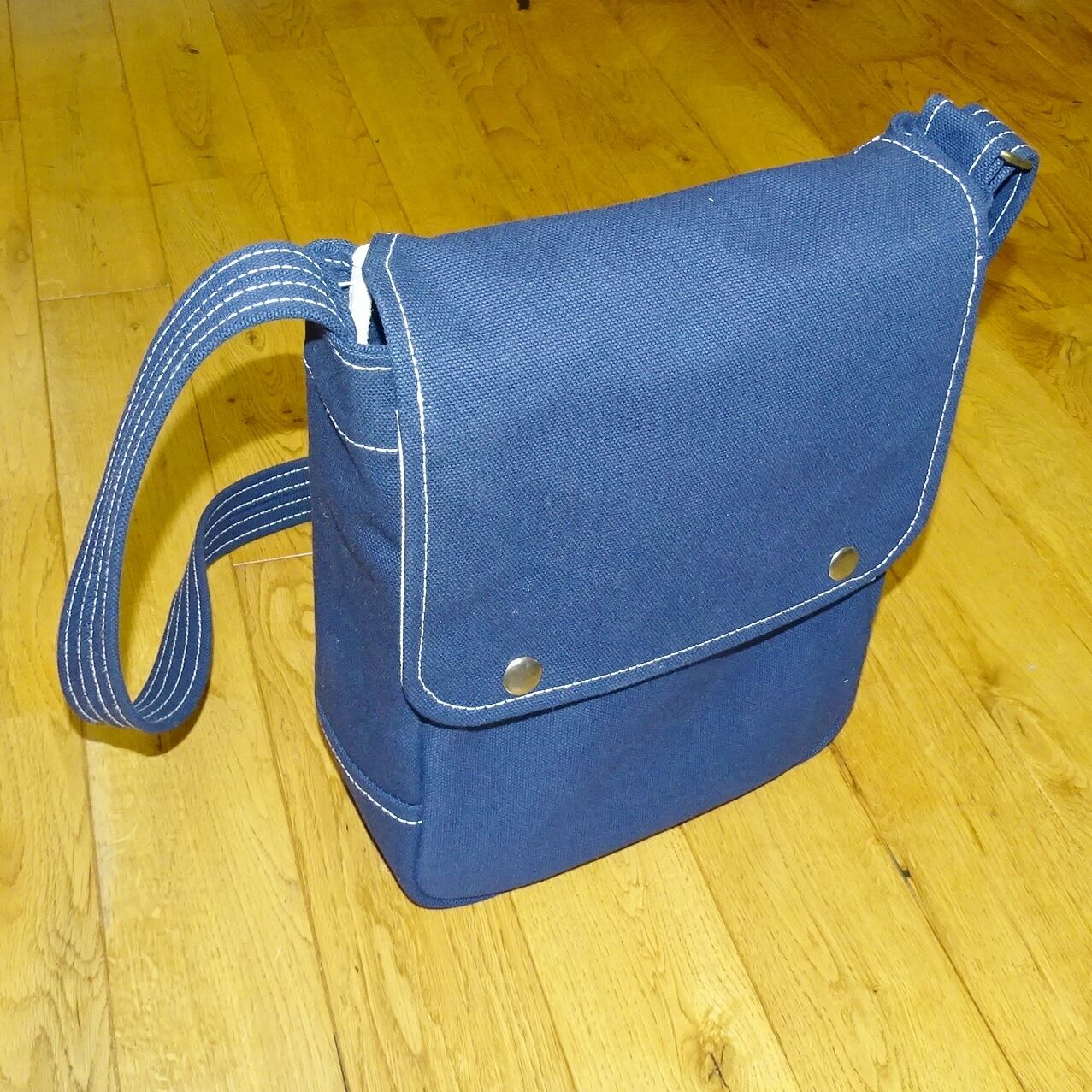 ■使用材:本体・ストラップ 6号帆布生 紺色、フラップ裏 8号帆布生成り、縁テープ 綿綾テープ20mm生成り、縫糸 20番ポリエステルスパン糸、スプリングホックボタン