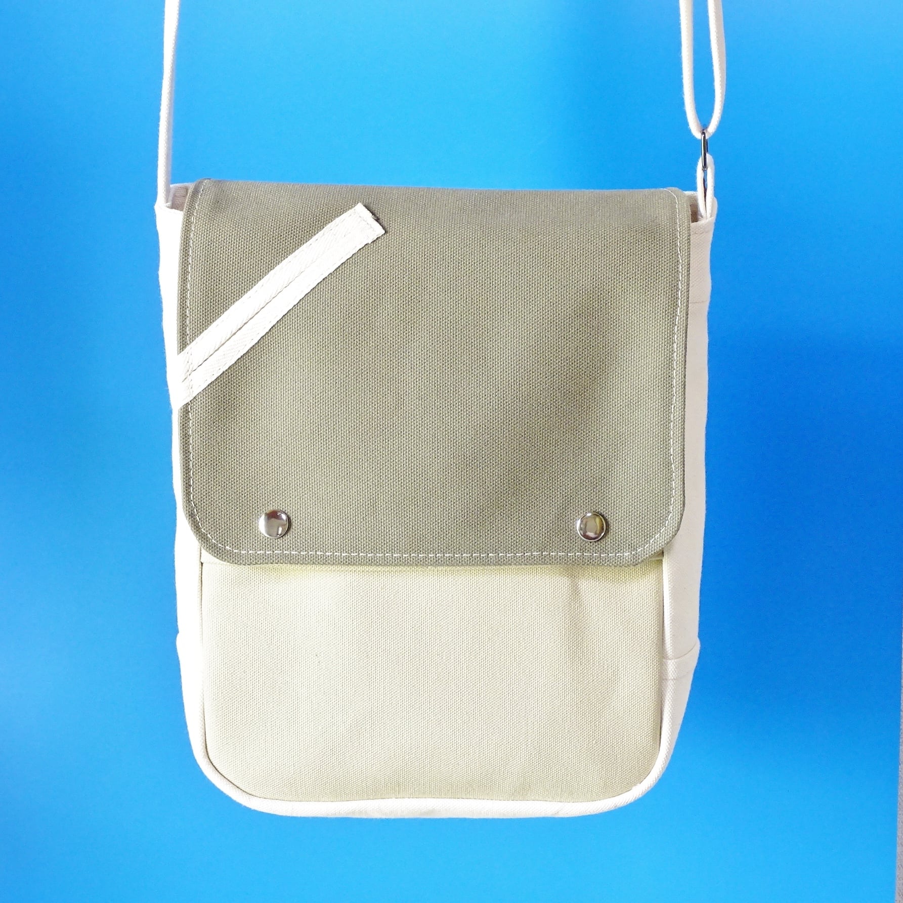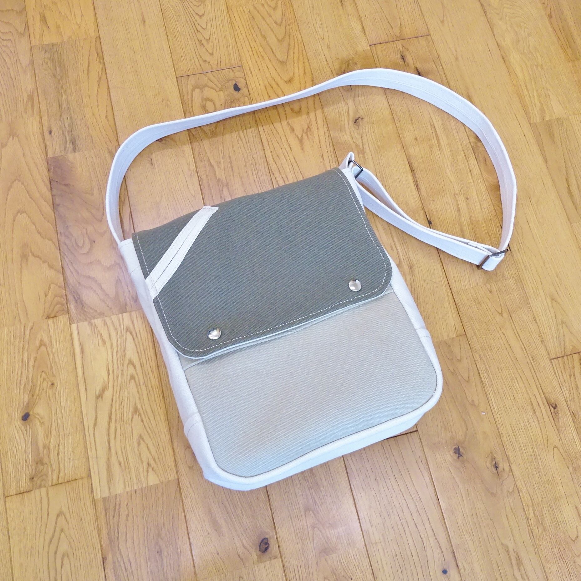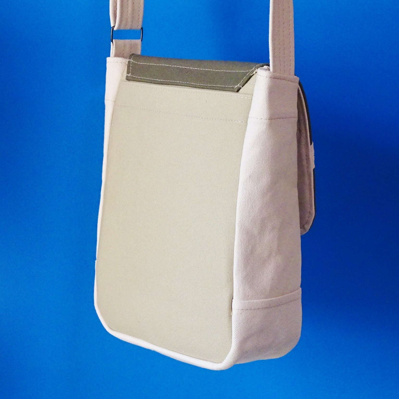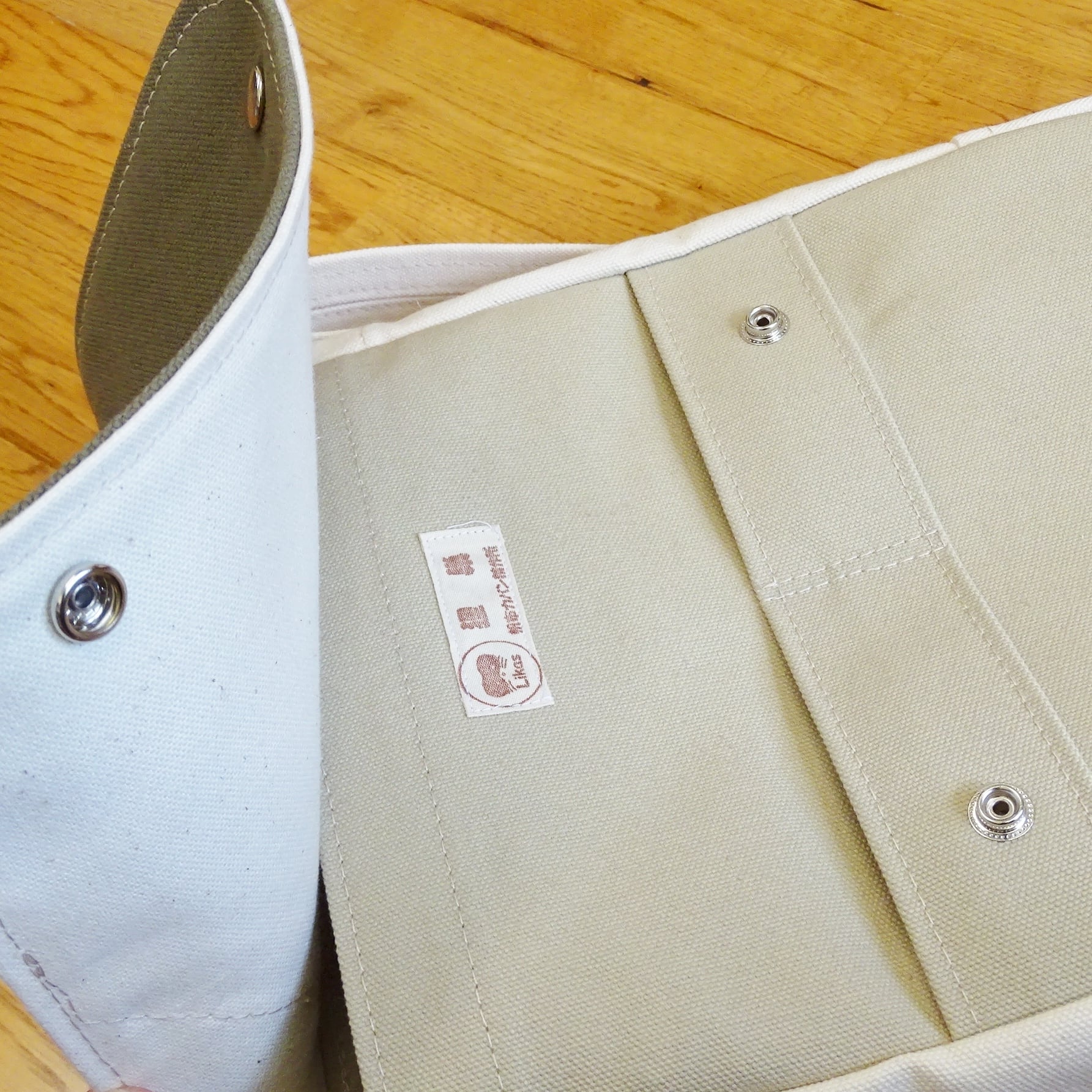 ■使用材:本体 6号帆布 ベージュ/生成り、フラップ 4号帆布 カーキ色、フラップ裏 11号帆布生成り、ストラップ 8号帆布生成り、縁テープ 綿綾テープ20mm生成り、縫糸 20番ポリエステルスパン糸、金属ジャンパーボタン