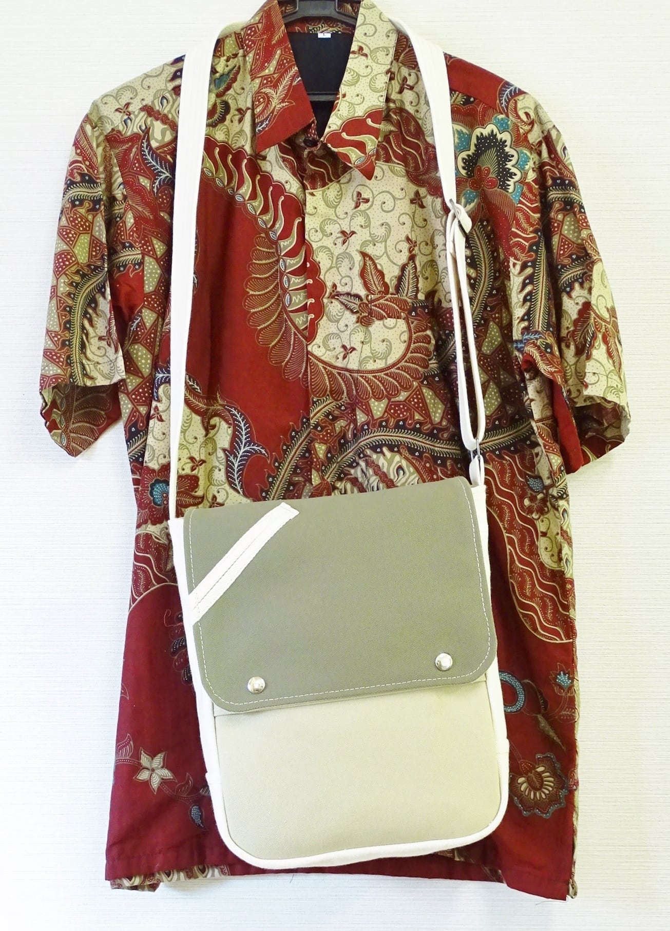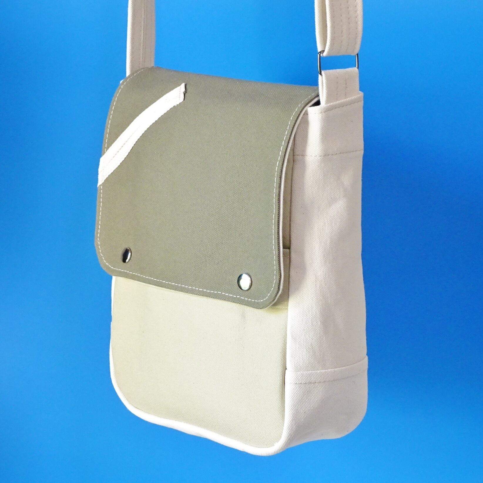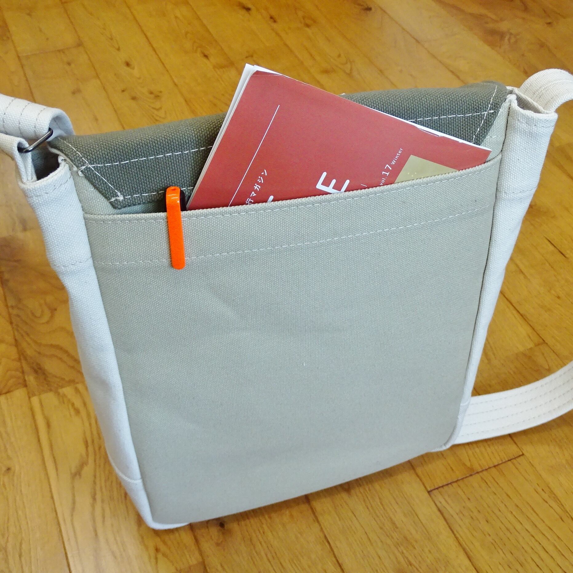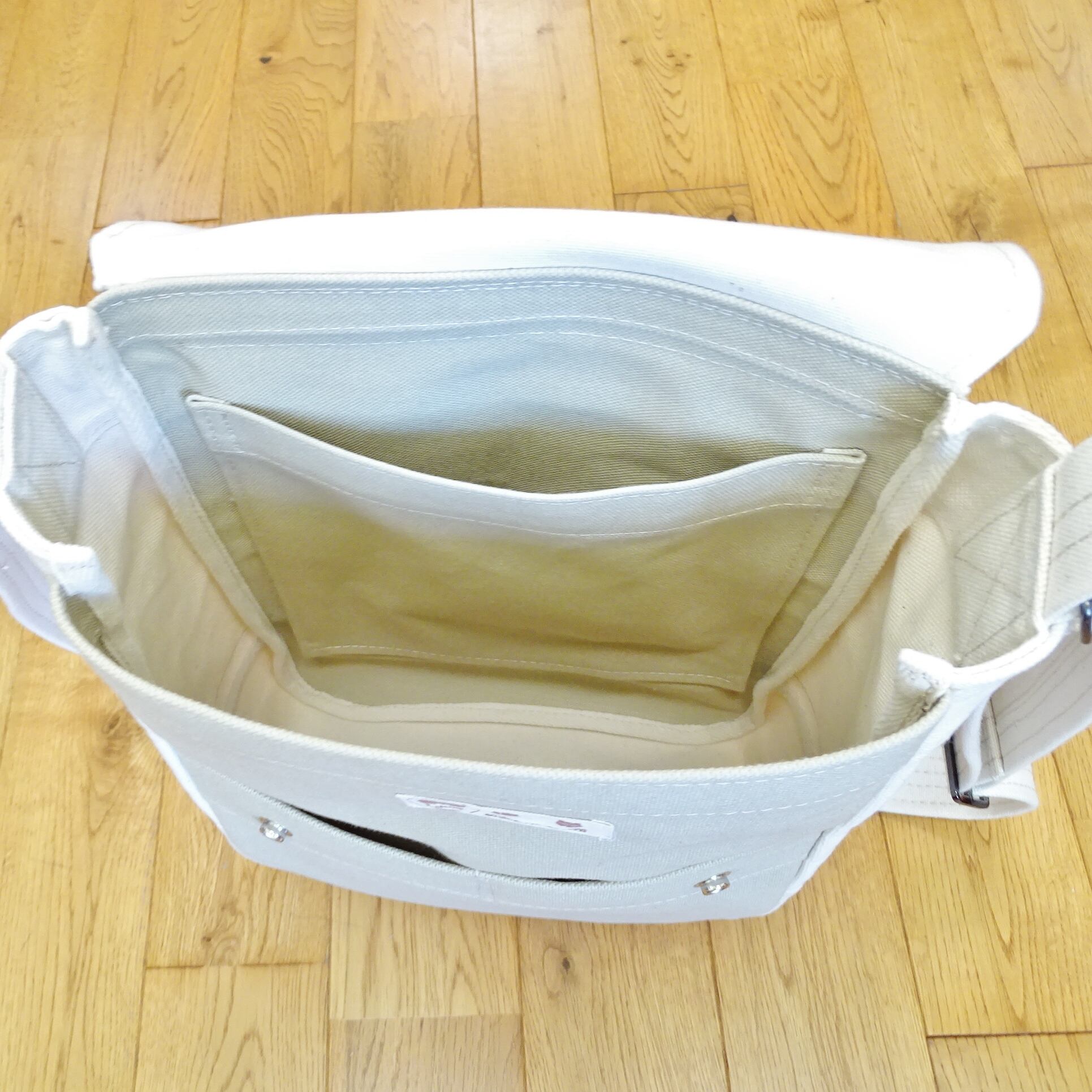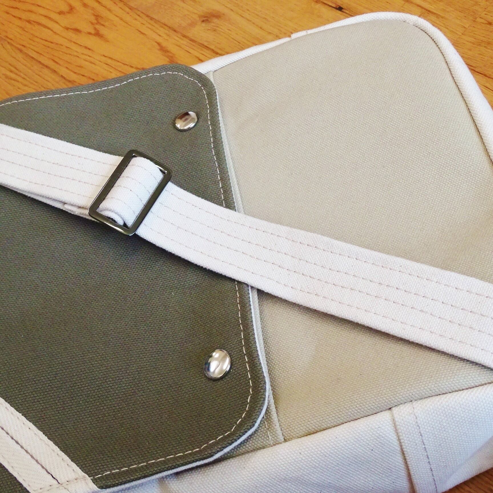 ■使用材:本体 6号帆布 ベージュ/生成り、フラップ 4号帆布 カーキ色、フラップ裏 11号帆布生成り、ストラップ 8号帆布生成り、縁テープ 綿綾テープ20mm生成り、縫糸 20番ポリエステルスパン糸、金属ジャンパーボタン