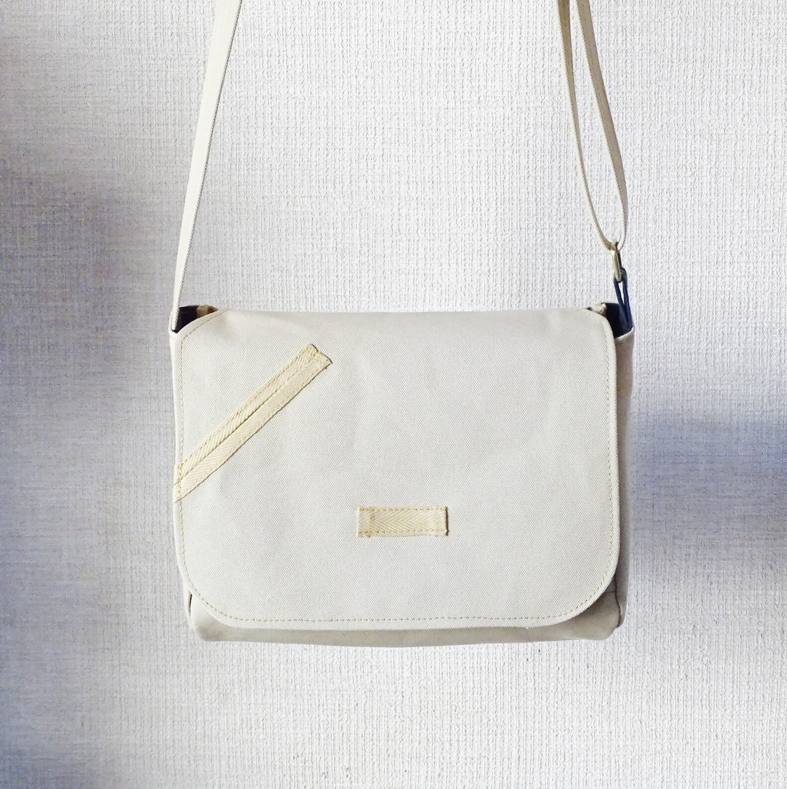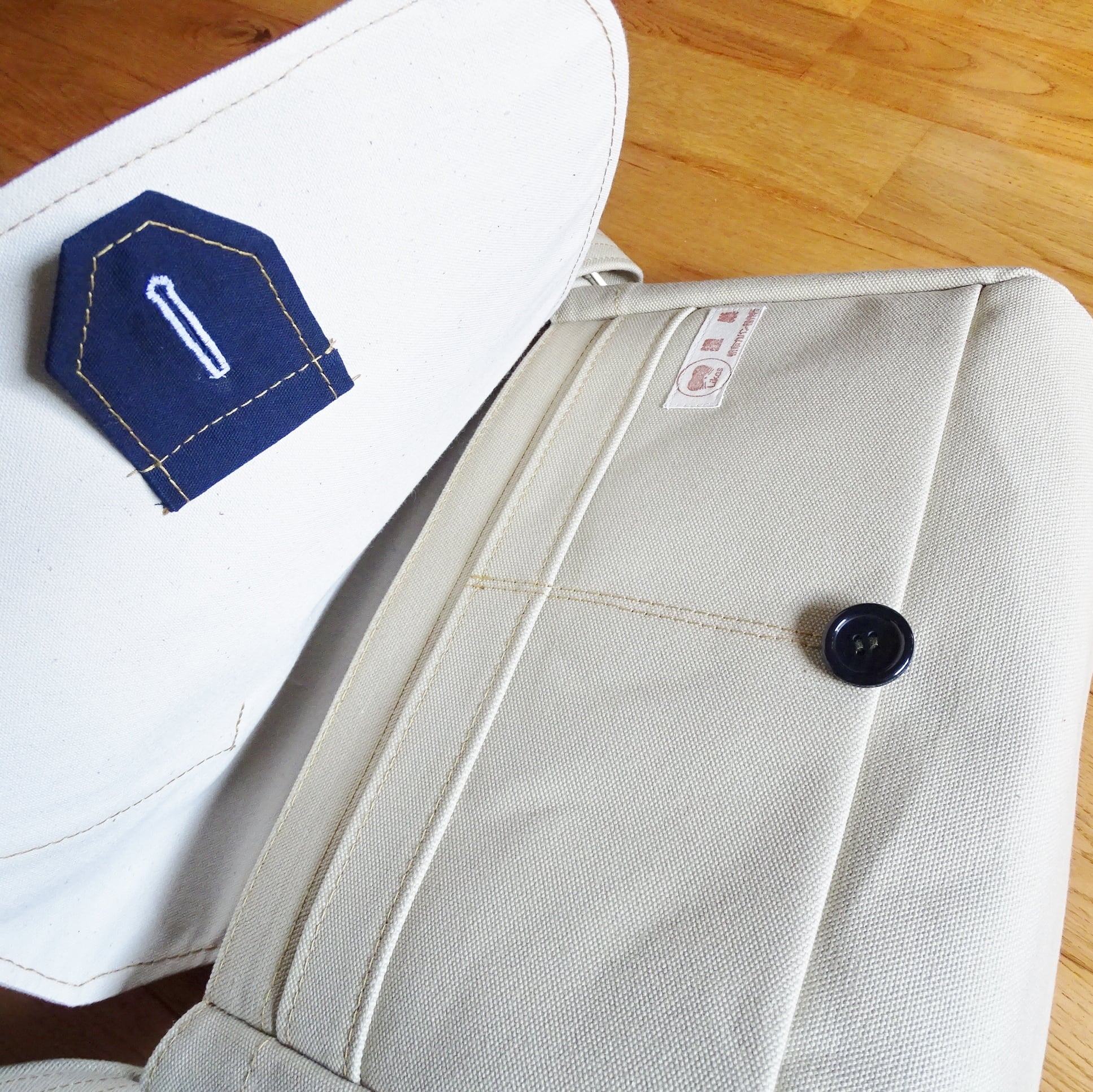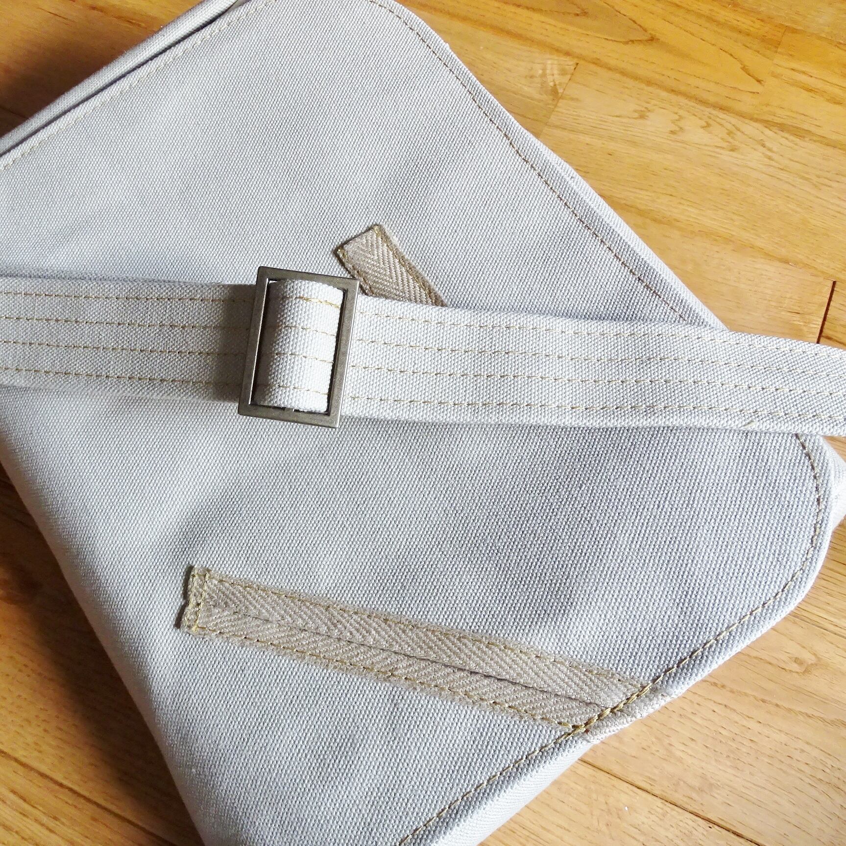 ■使用材:本体/フラップ/ストラップ 6号帆布撥水加工 サンドベージュ、フラップ裏 11号帆 布生成り、縁テープ ポリエステル綾テープ20mmベージュ、縫糸 20番ポリエステルスパン糸、樹脂ボタン