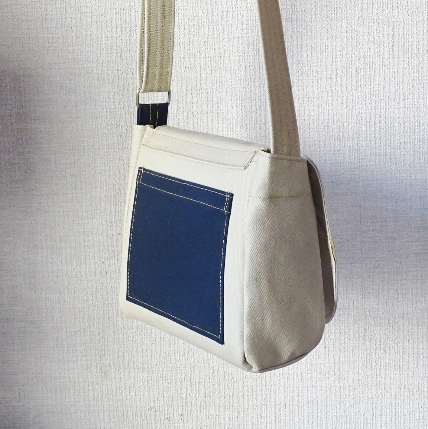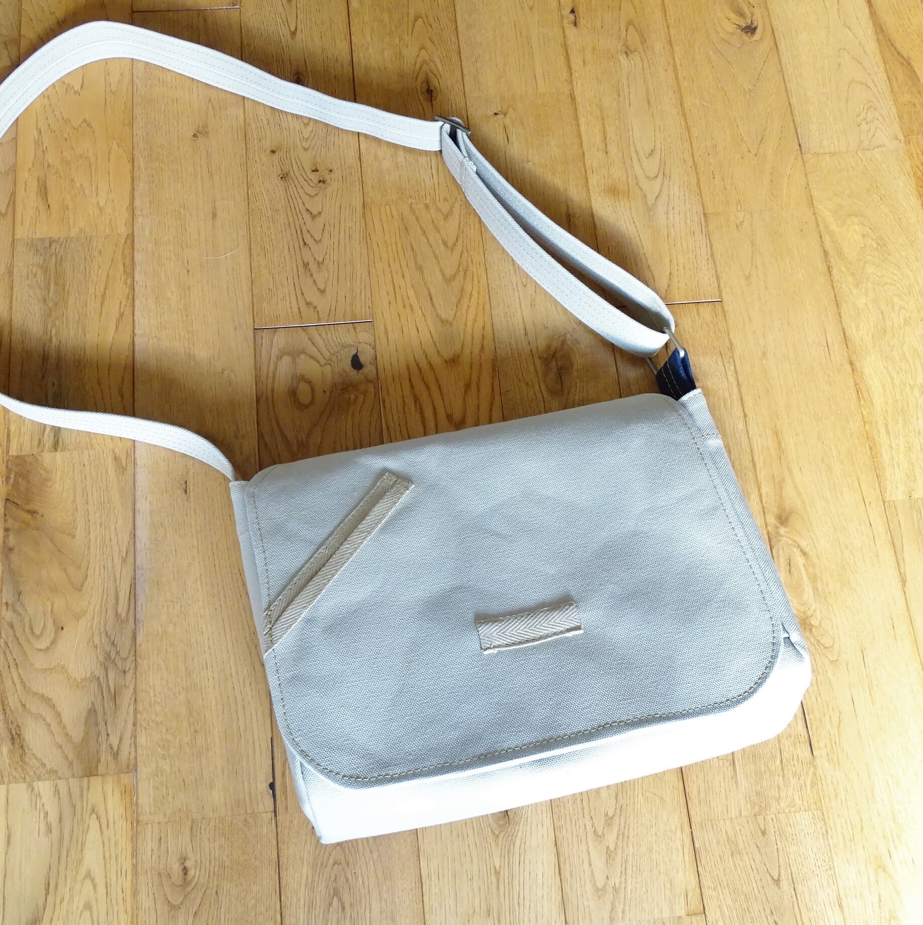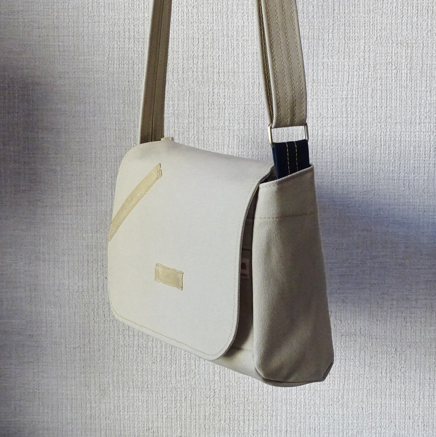 ■使用材:本体/フラップ/ストラップ 6号帆布撥水加工 サンドベージュ、フラップ裏 11号帆 布生成り、縁テープ ポリエステル綾テープ20mmベージュ、縫糸 20番ポリエステルスパン糸、樹脂ボタン