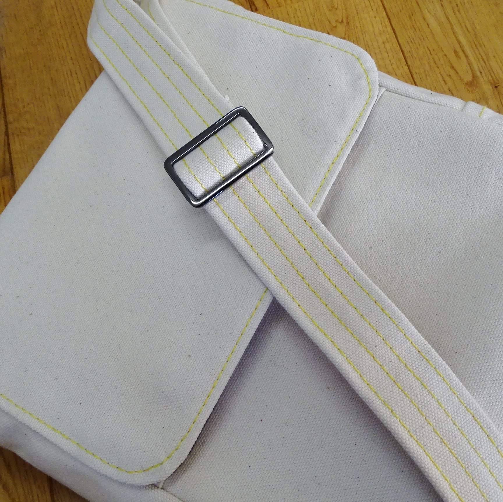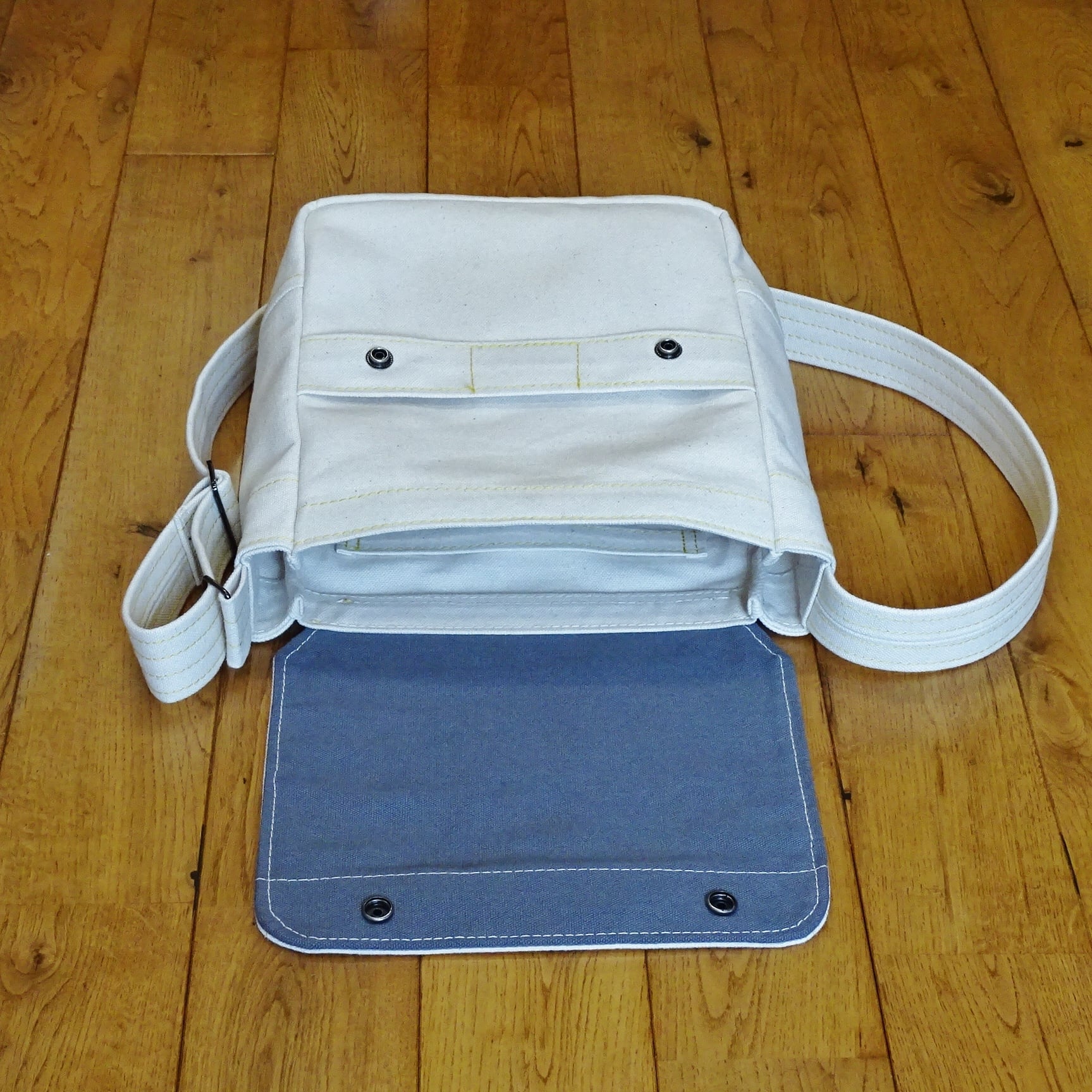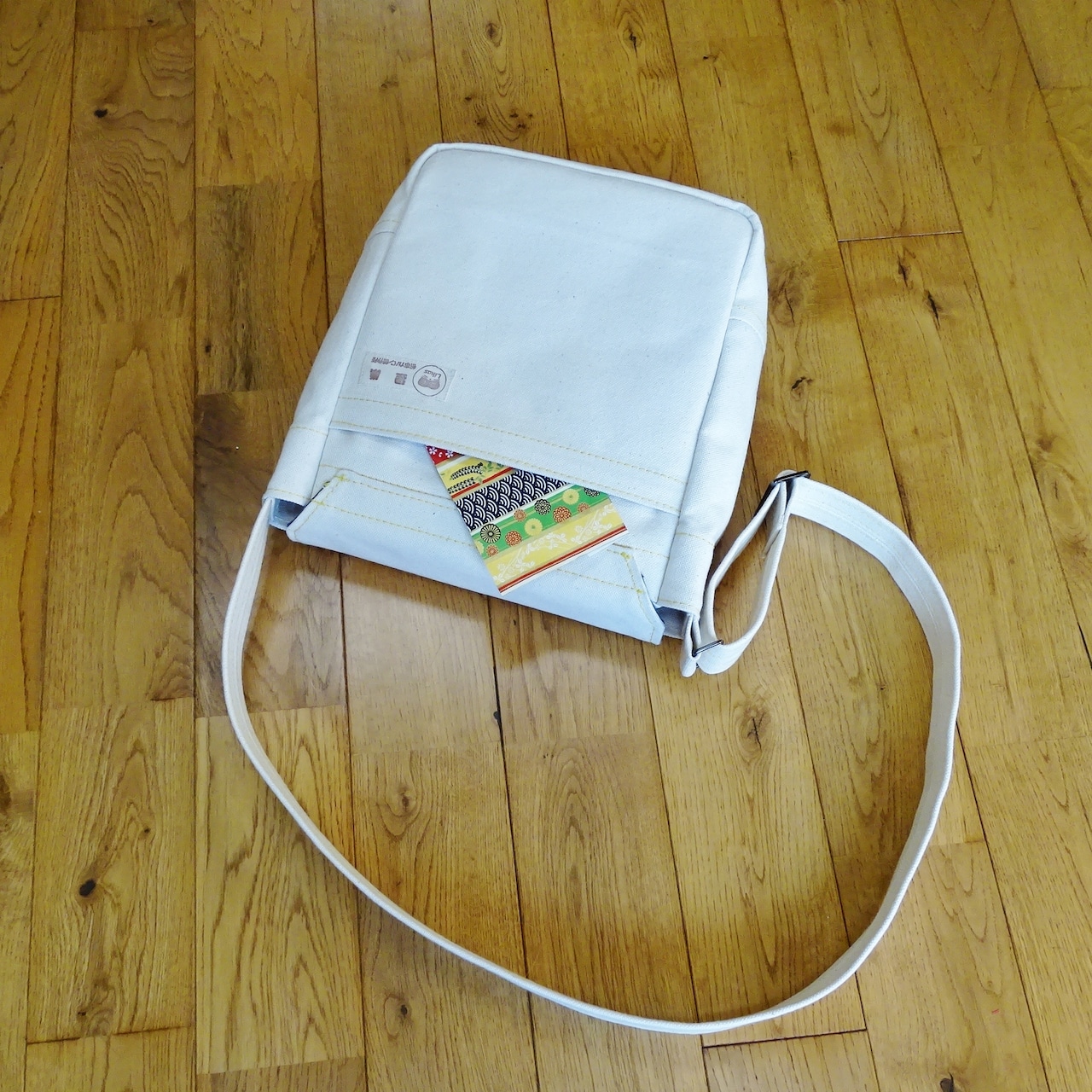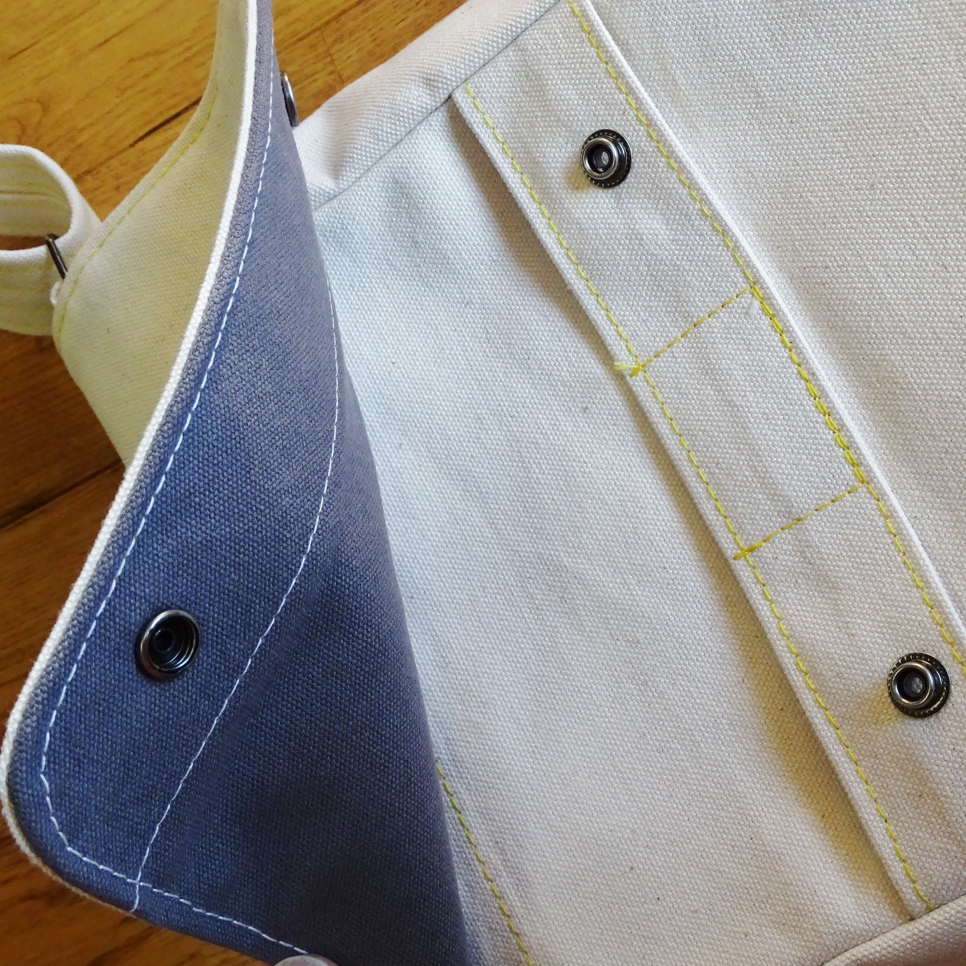 ■使用材:本体/フラップ/ストラップ 8号帆布生成り、フラップ裏 10号帆布ブラウン、縁テープ 綿綾テープ20mm生成り、縫糸 20番ポリエステルスパン糸、ジャンパーホックボタン、