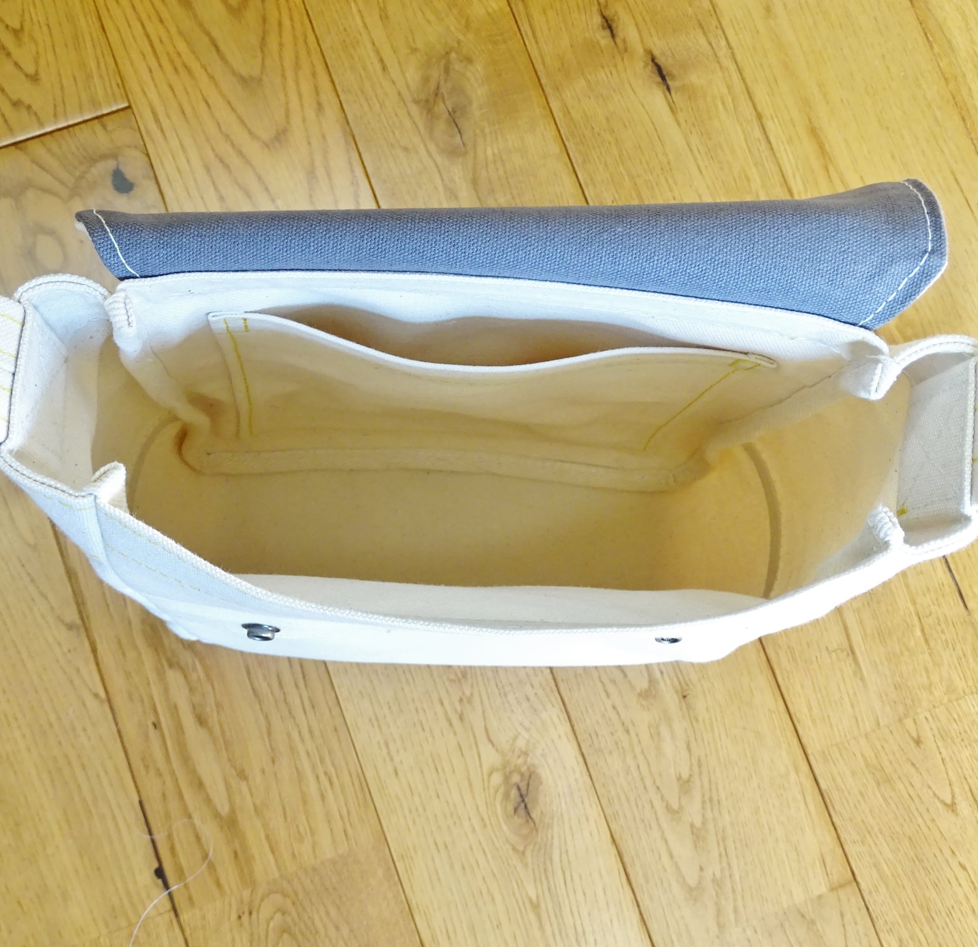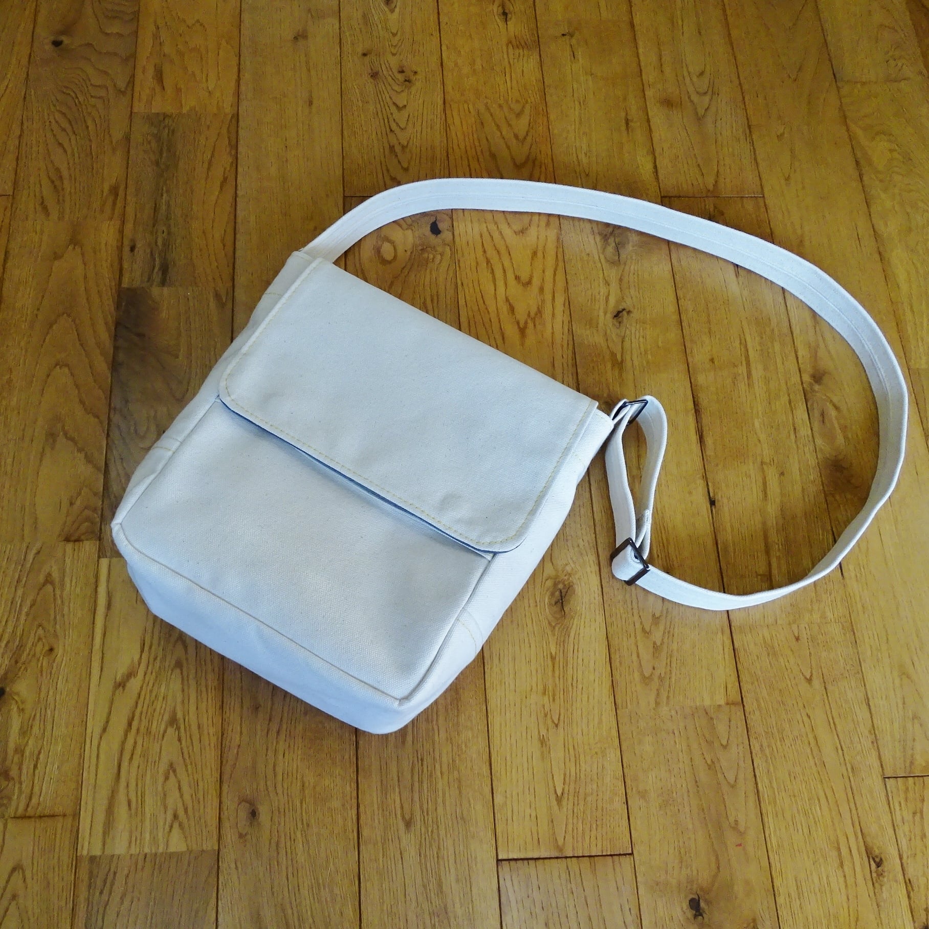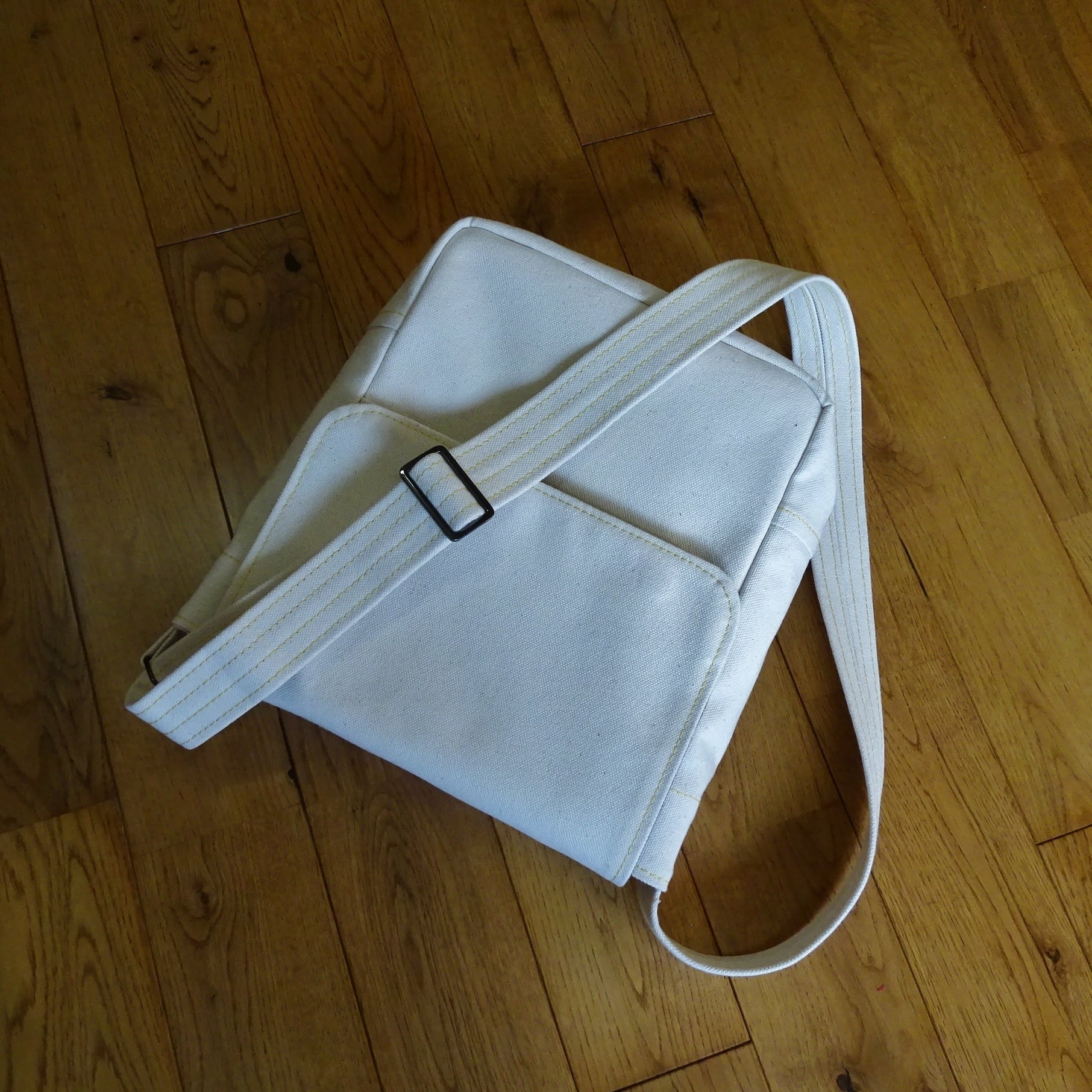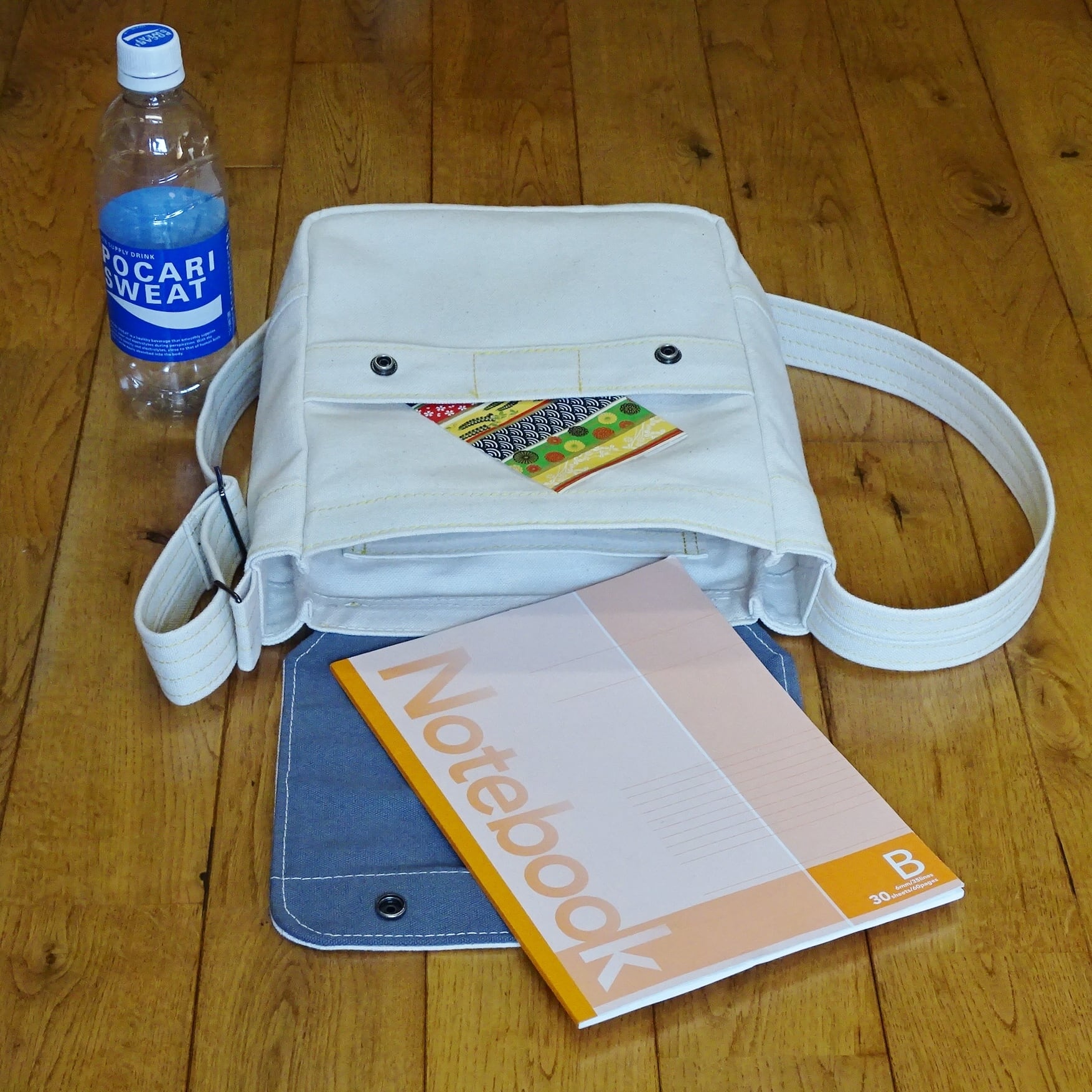 ■使用材:本体/フラップ/ストラップ 8号帆布生成り、フラップ裏 10号帆布ブラウン、縁テープ 綿綾テープ20mm生成り、縫糸 20番ポリエステルスパン糸、ジャンパーホックボタン、