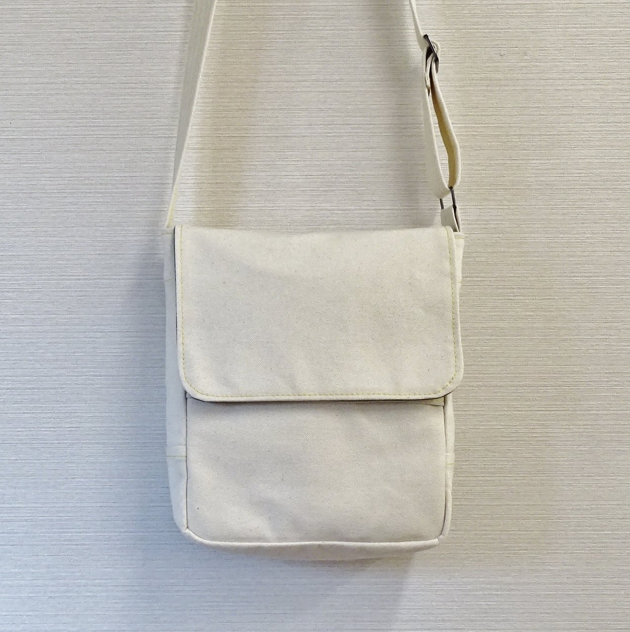シンプルで洗練されたデザインのメッセンジャーバッグです。自然な生成りのカラーは、素朴ななスタイルに調和し、普段使いやお出かけにも最適なアイテムです。ポーチは軽量で持ち運びやすく、必要な小物を安心して収納できる仕組みになっています。耐久性に優れた帆布を使用しており、長く愛用いただける一品です。