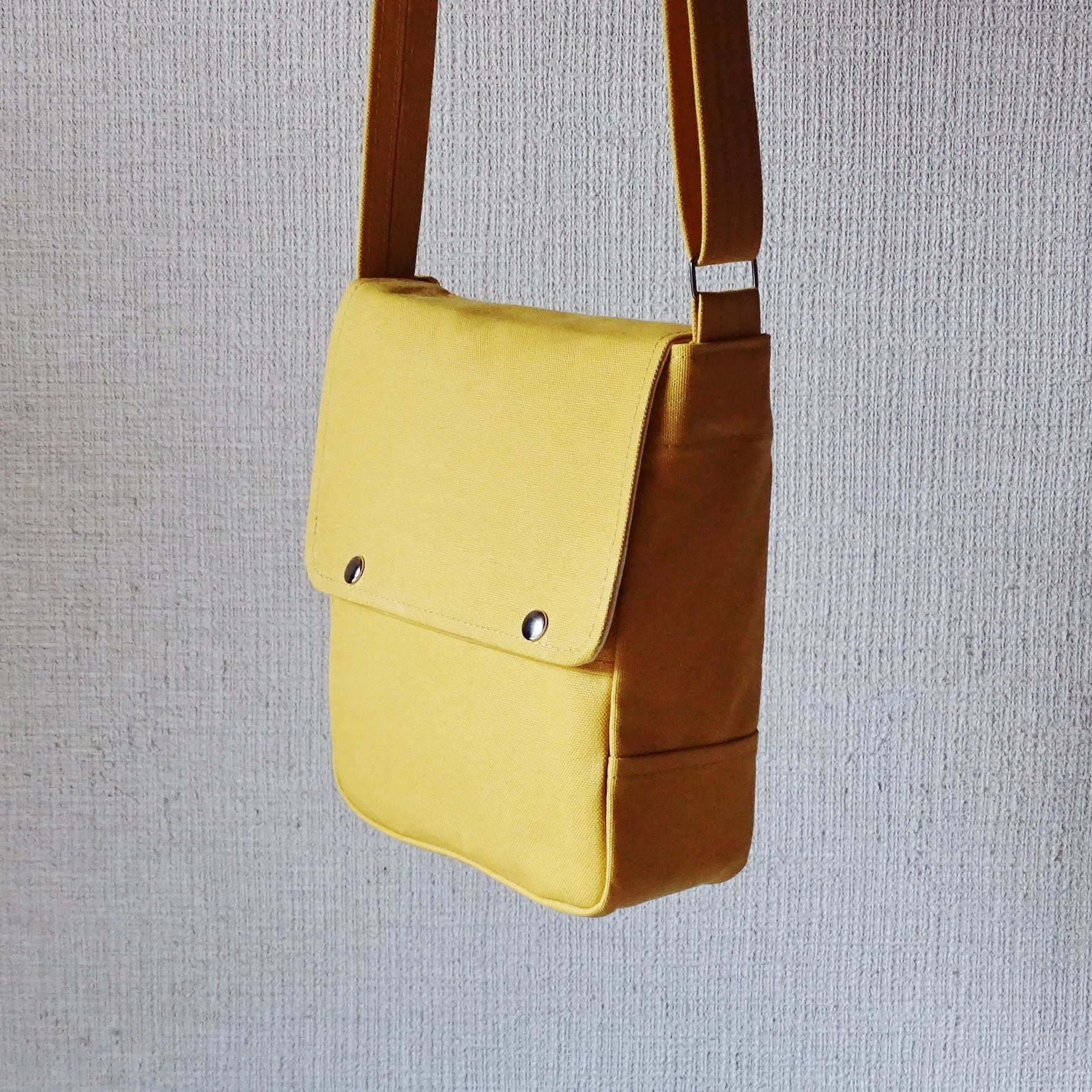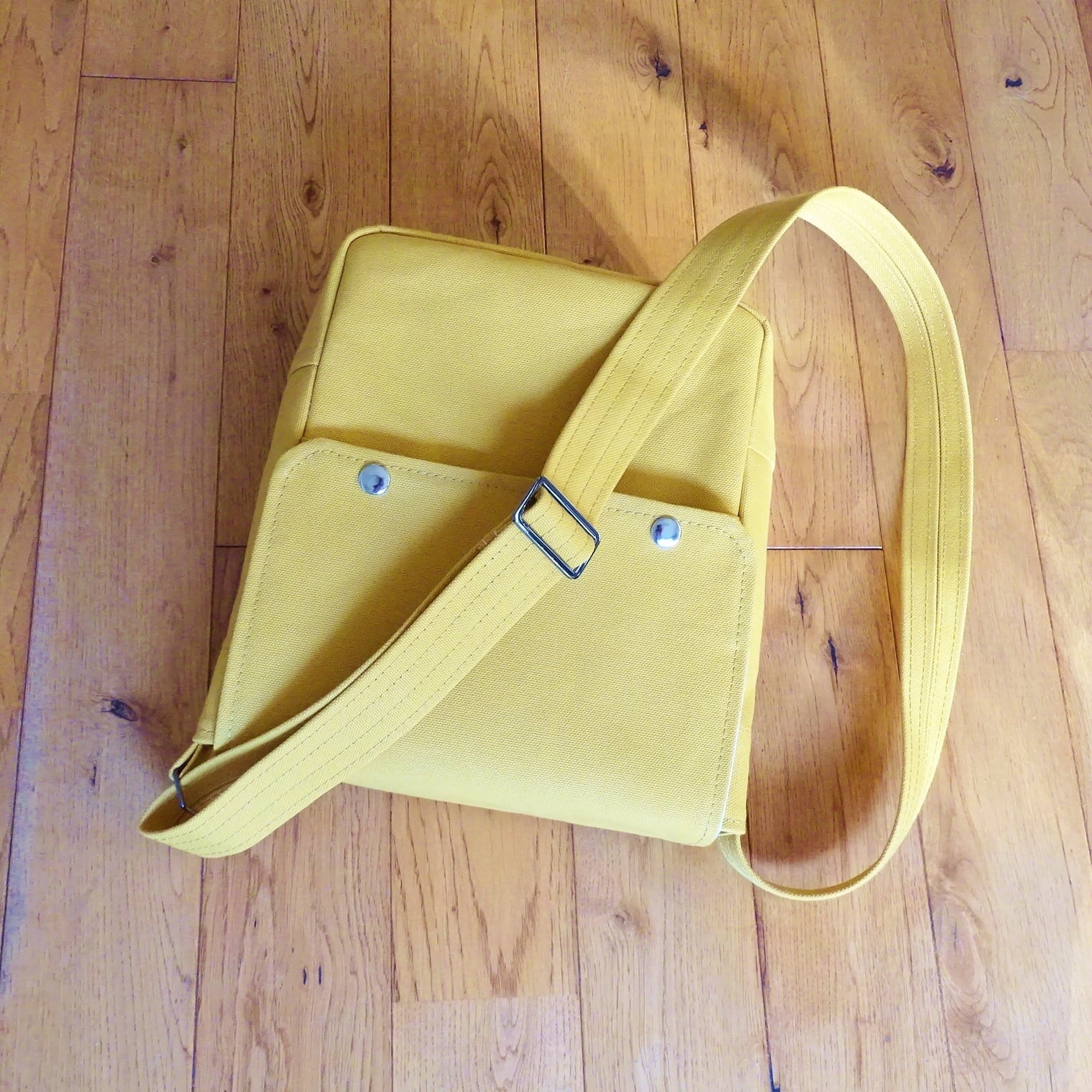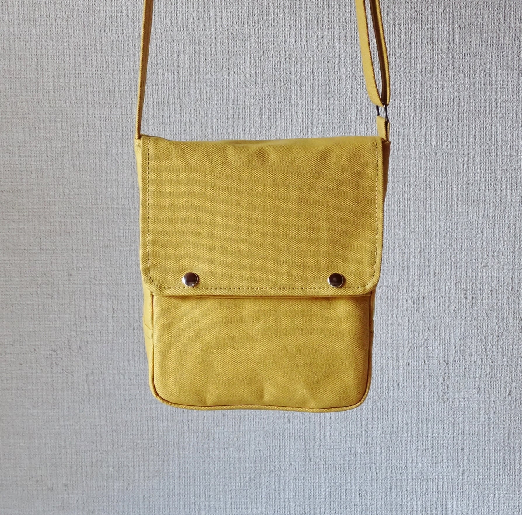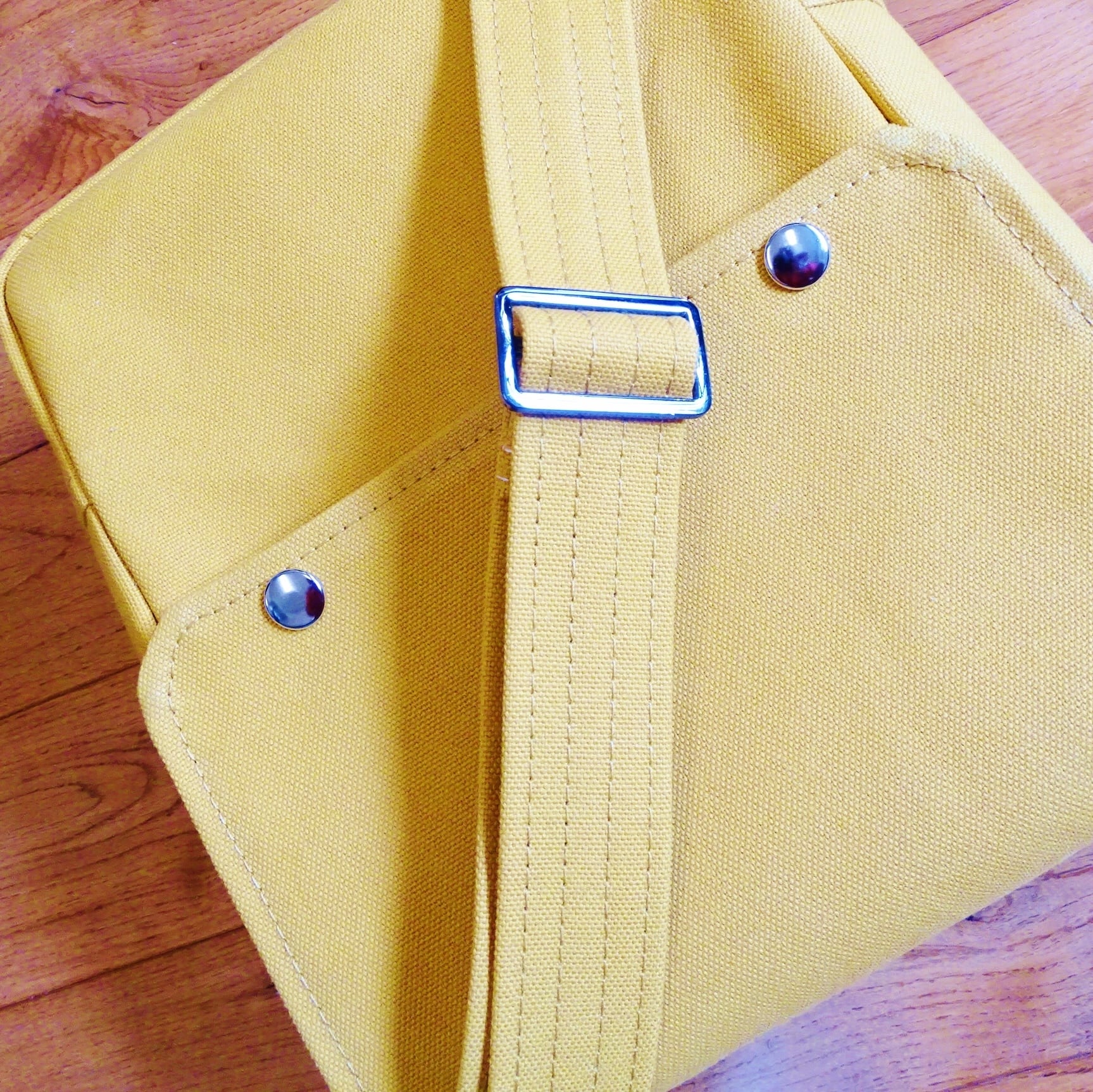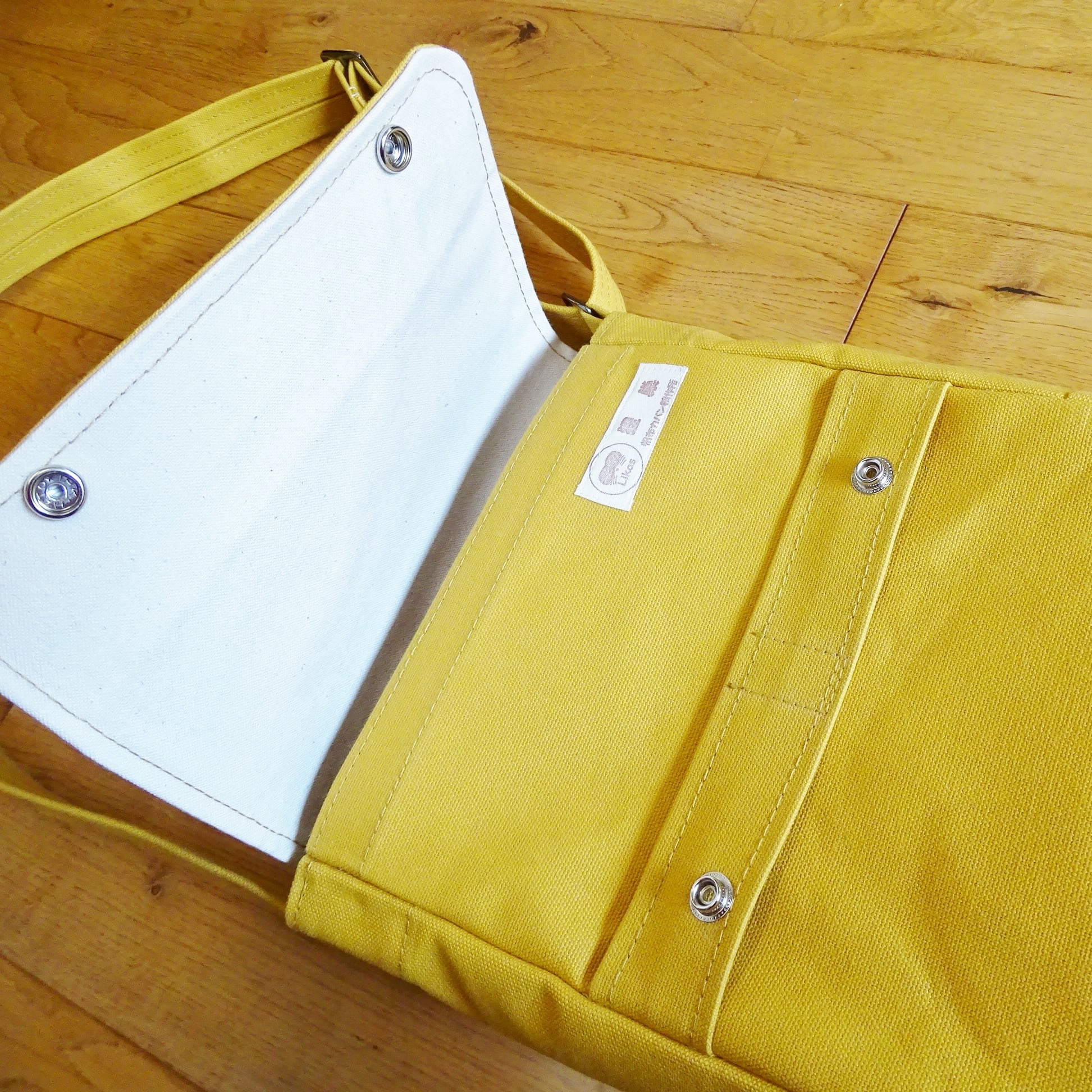 ■使用材:本体/ストラップ/フラップ 8号帆布 マスタードイエロー、フラップ裏 11号帆布 生成り、縁テープ 綿綾テープ20mm生成り、縫糸 20番ポリエステルスパン糸、ジャンパースナップボタン