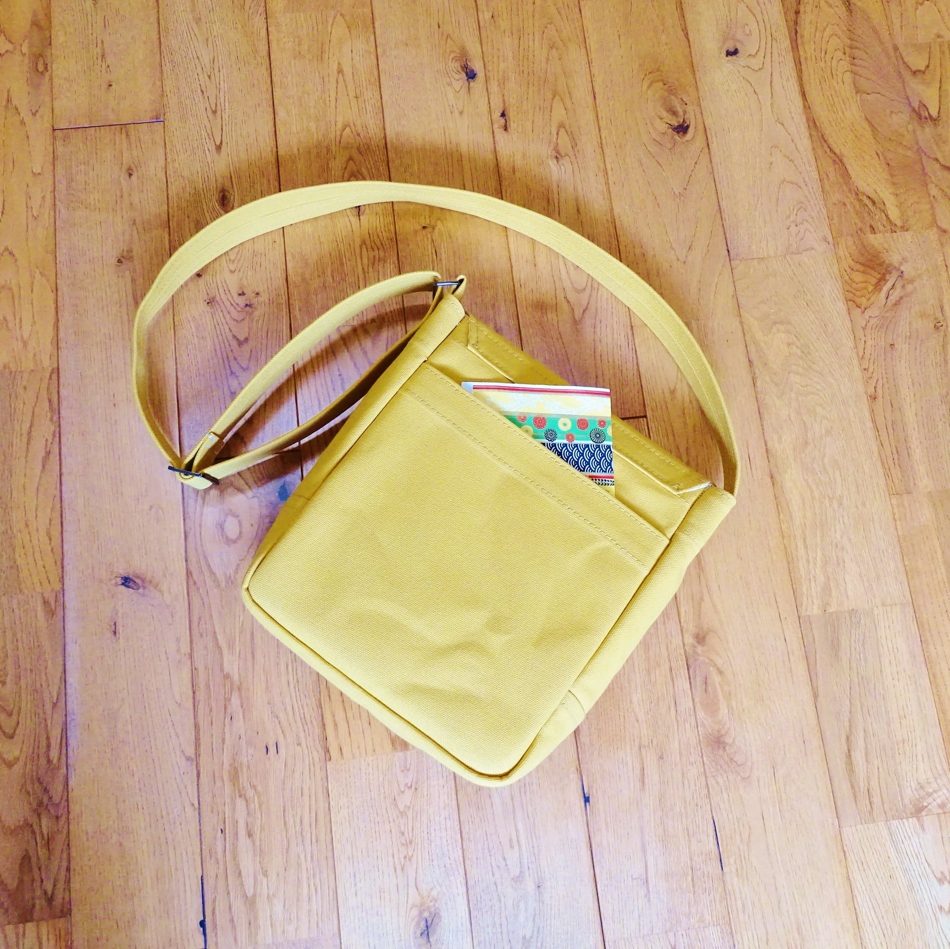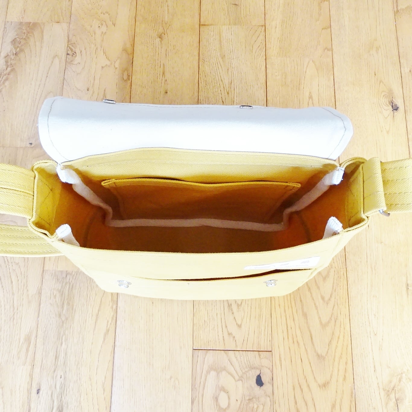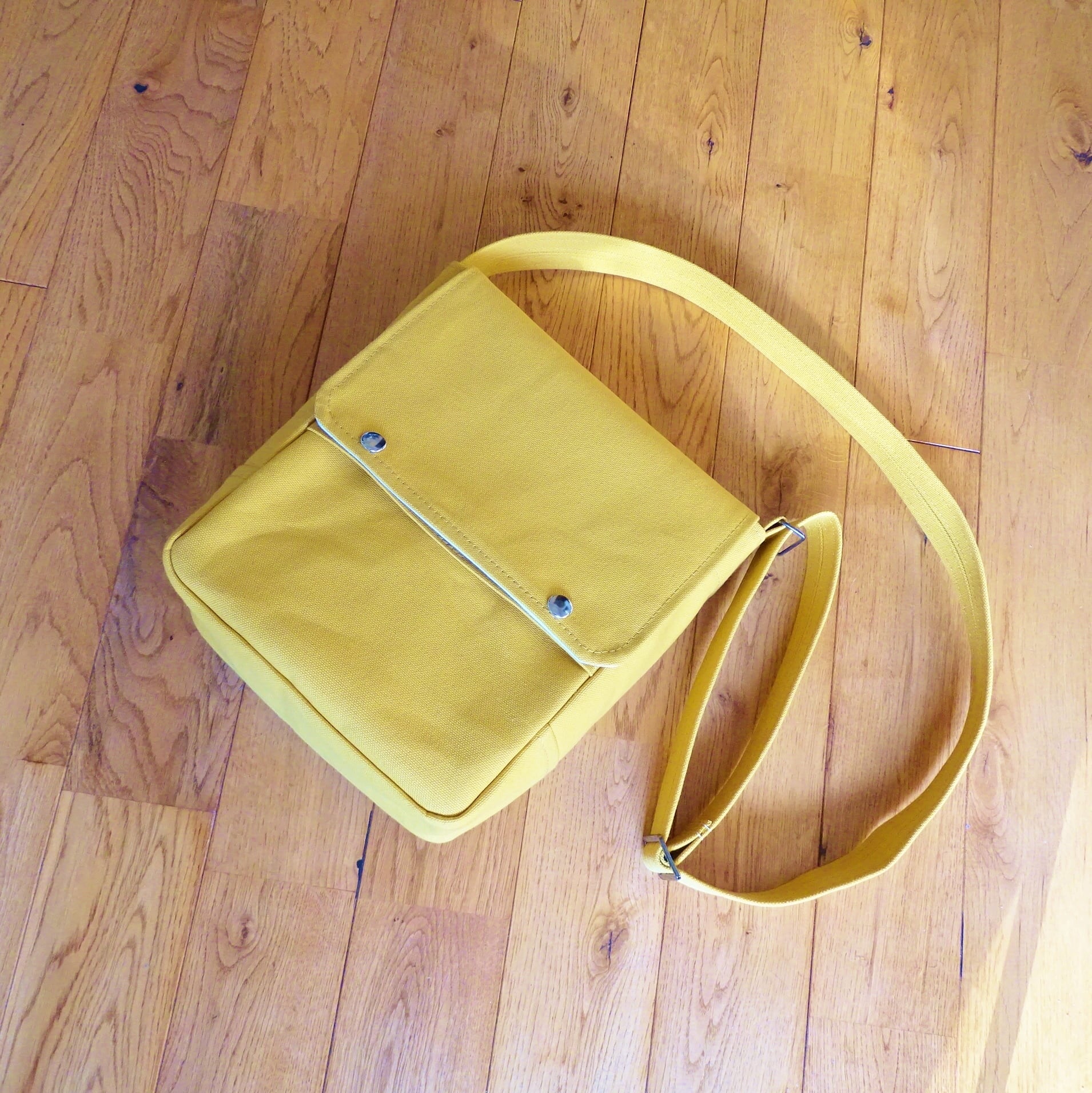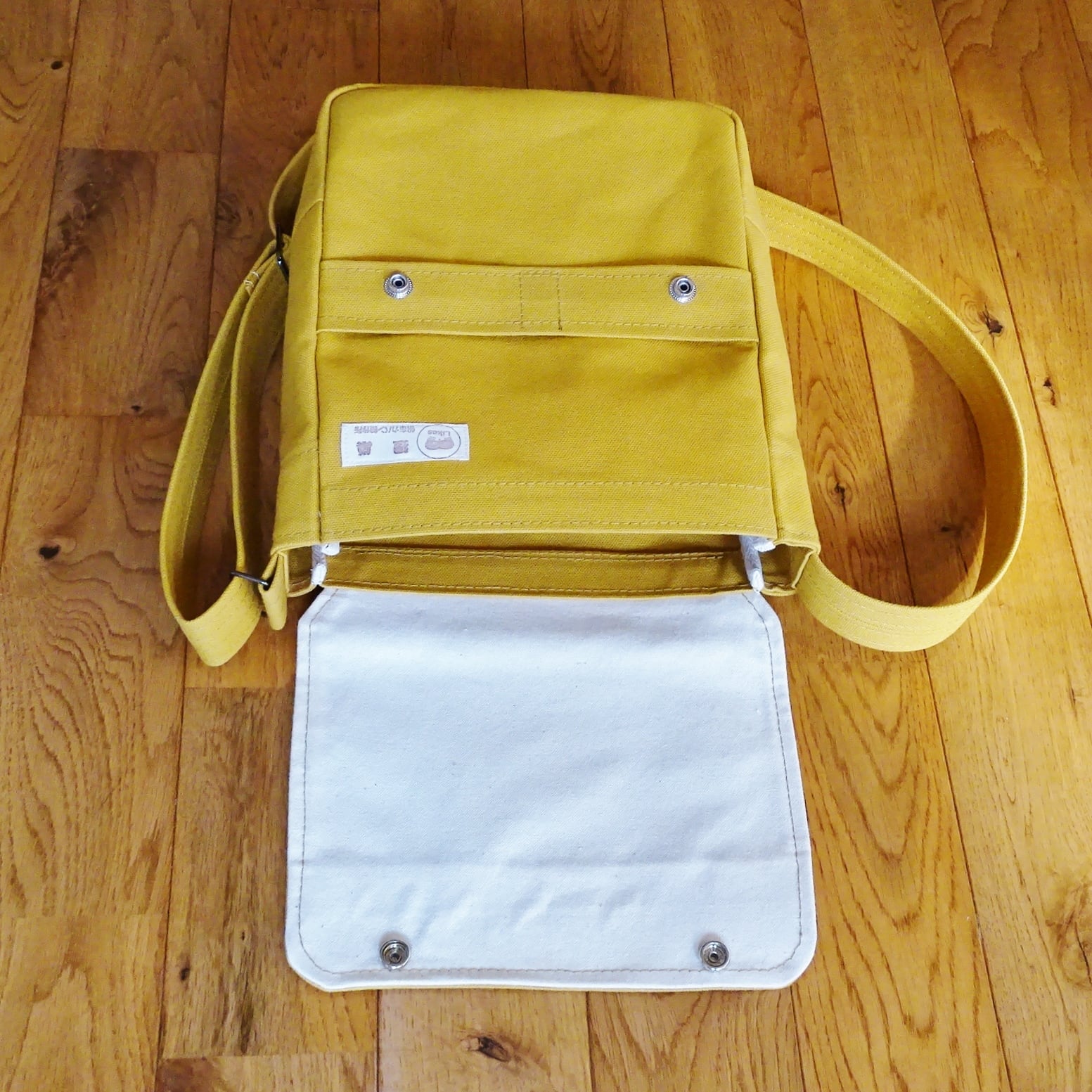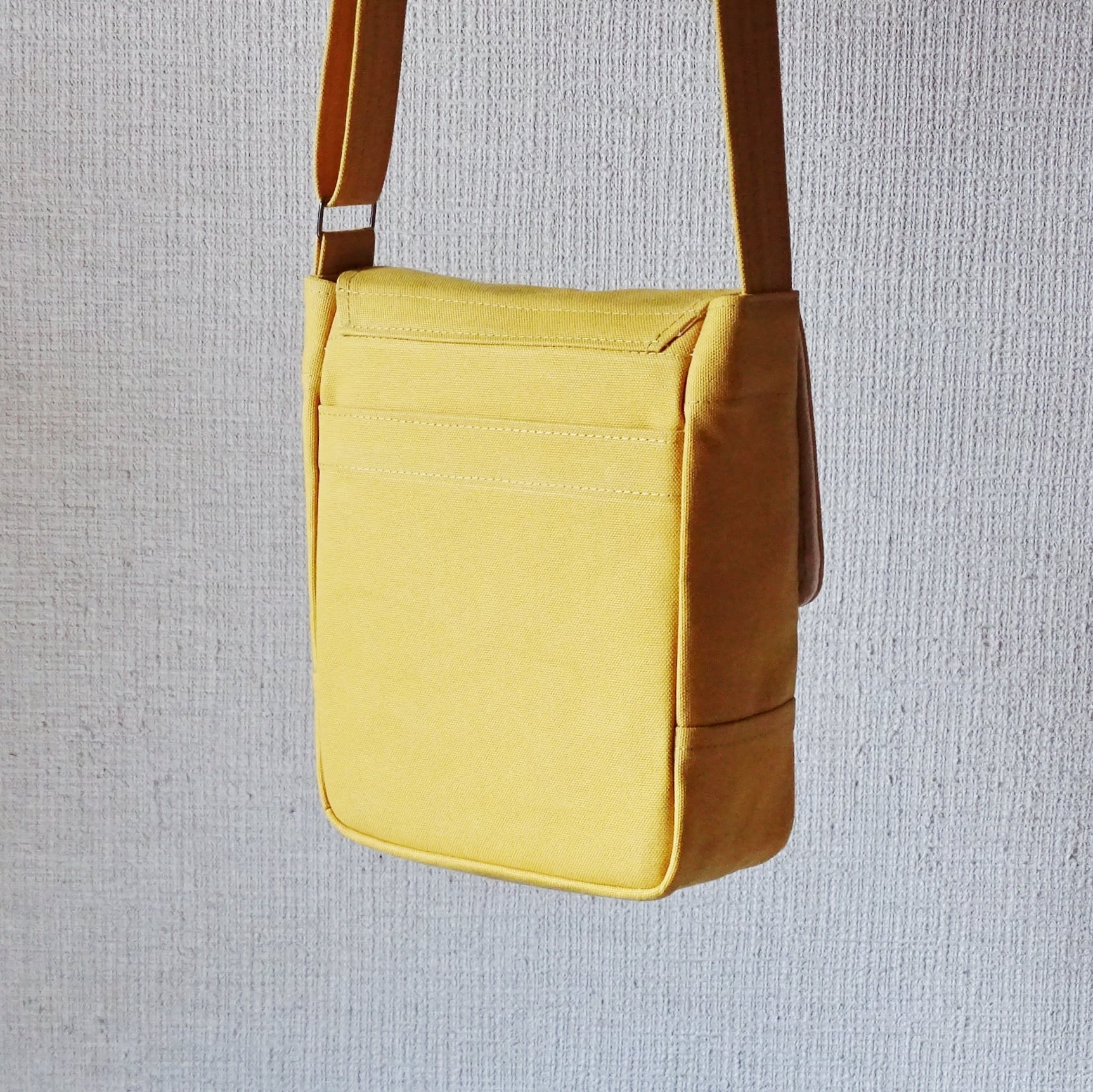 ■使用材:本体/ストラップ/フラップ 8号帆布 マスタードイエロー、フラップ裏 11号帆布 生成り、縁テープ 綿綾テープ20mm生成り、縫糸 20番ポリエステルスパン糸、ジャンパースナップボタン
