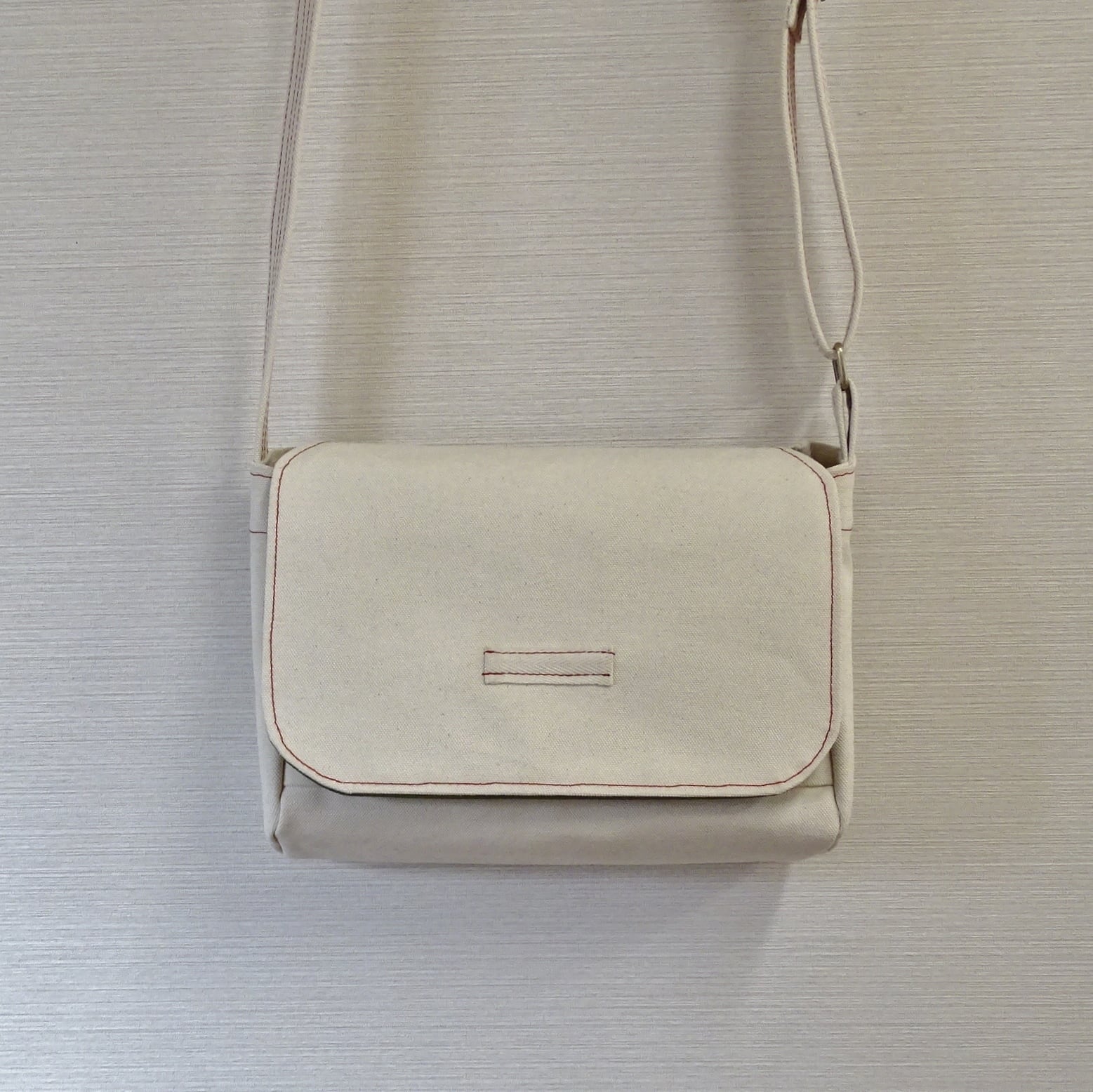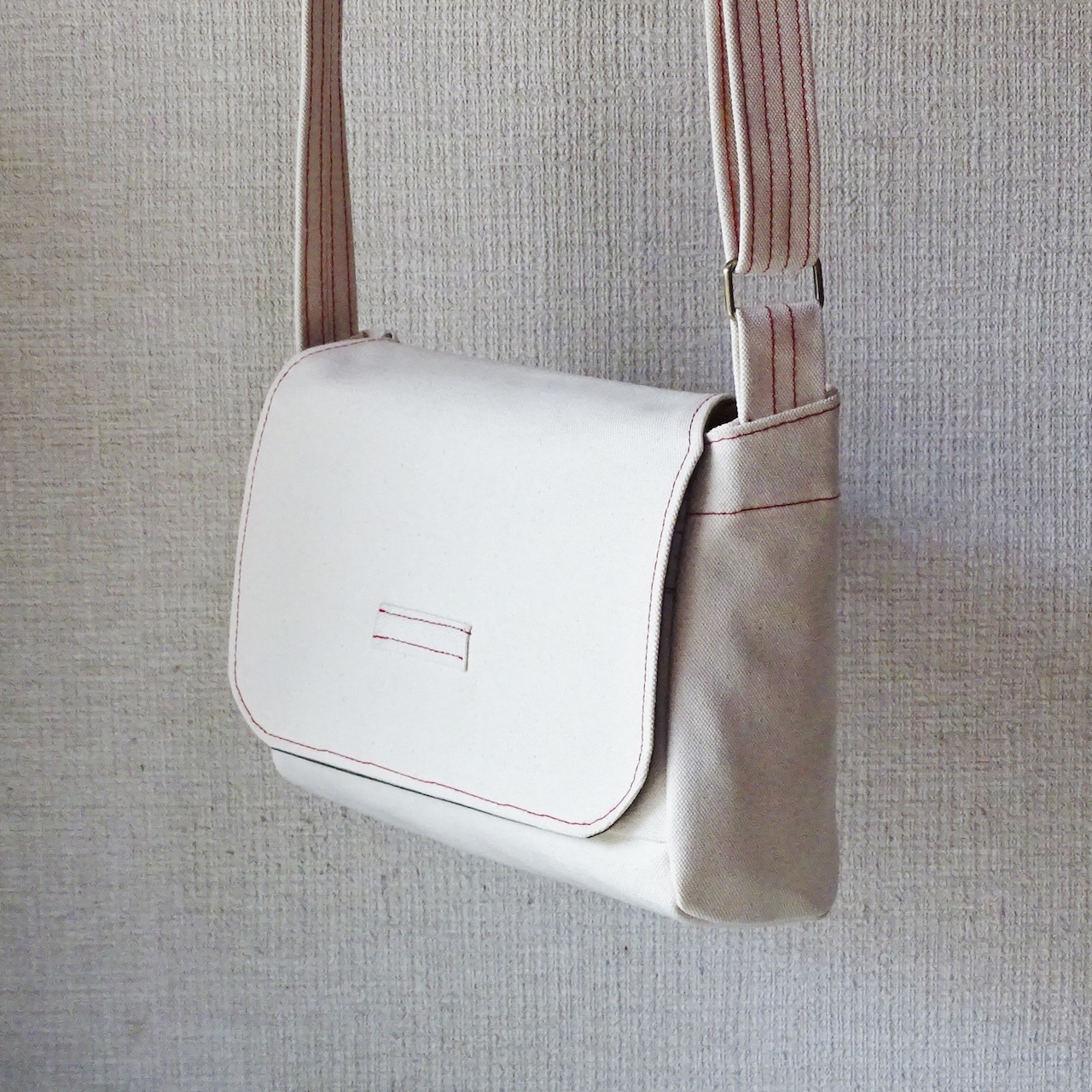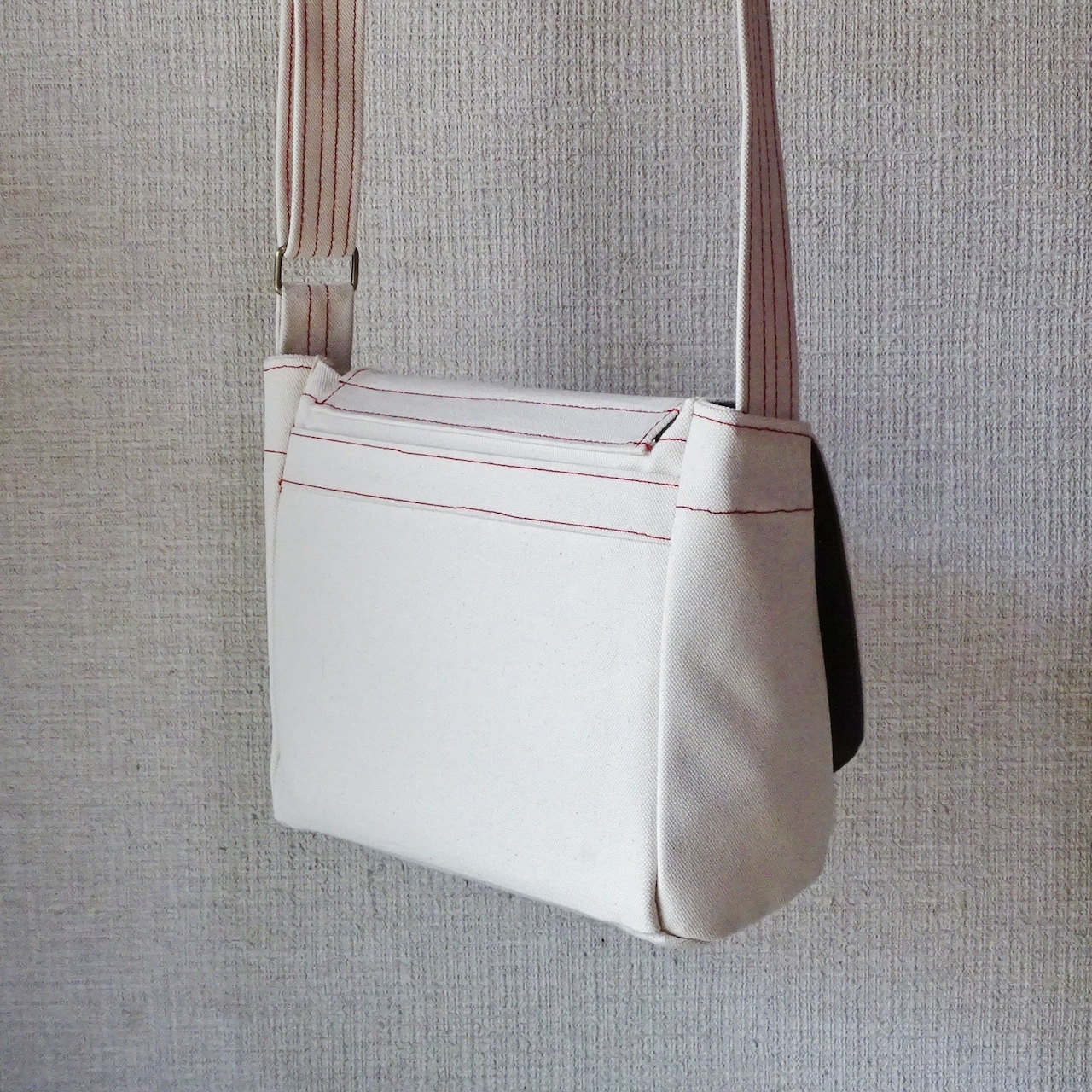しっかりとした作りのメッセンジャーバッグ です。耐久性に優れた6号帆布を使用しており、重量物や硬い物も安心して持ち運びきます。A4サイズに対応しており、書類や書籍をしっかり収納できる他、必要な小物を簡単に収納できるポケットも搭載しています。シンプルなデザインですが、赤色のステッチで素朴なななかにアクセントのあるスタイルを表現しています。