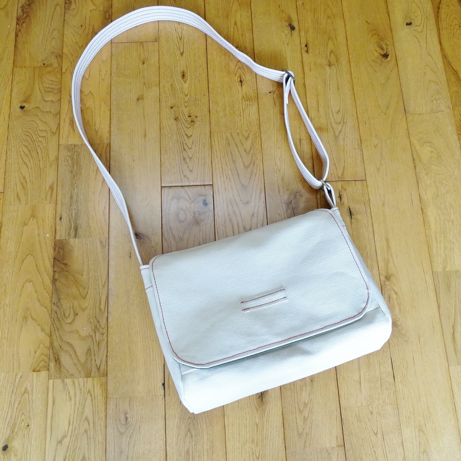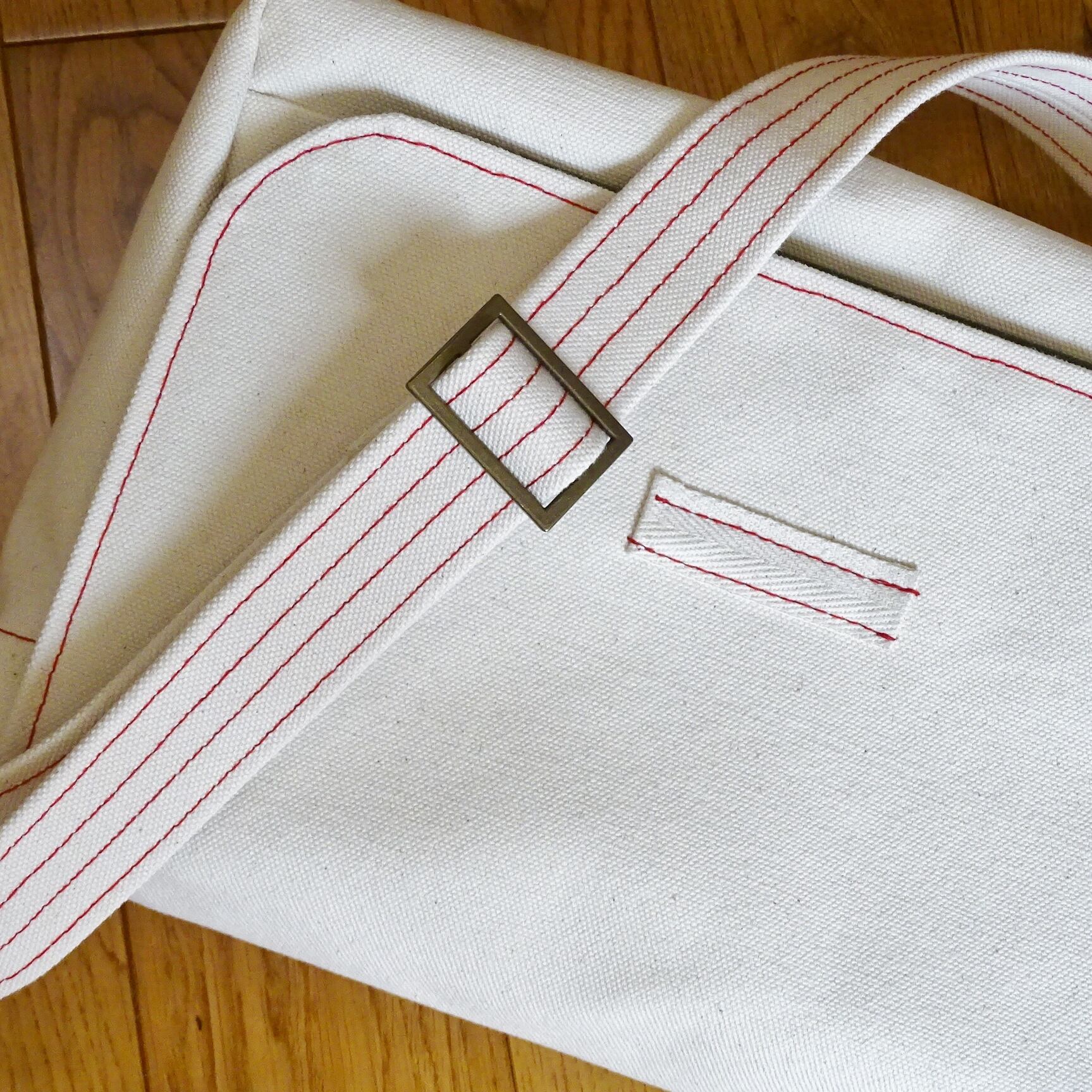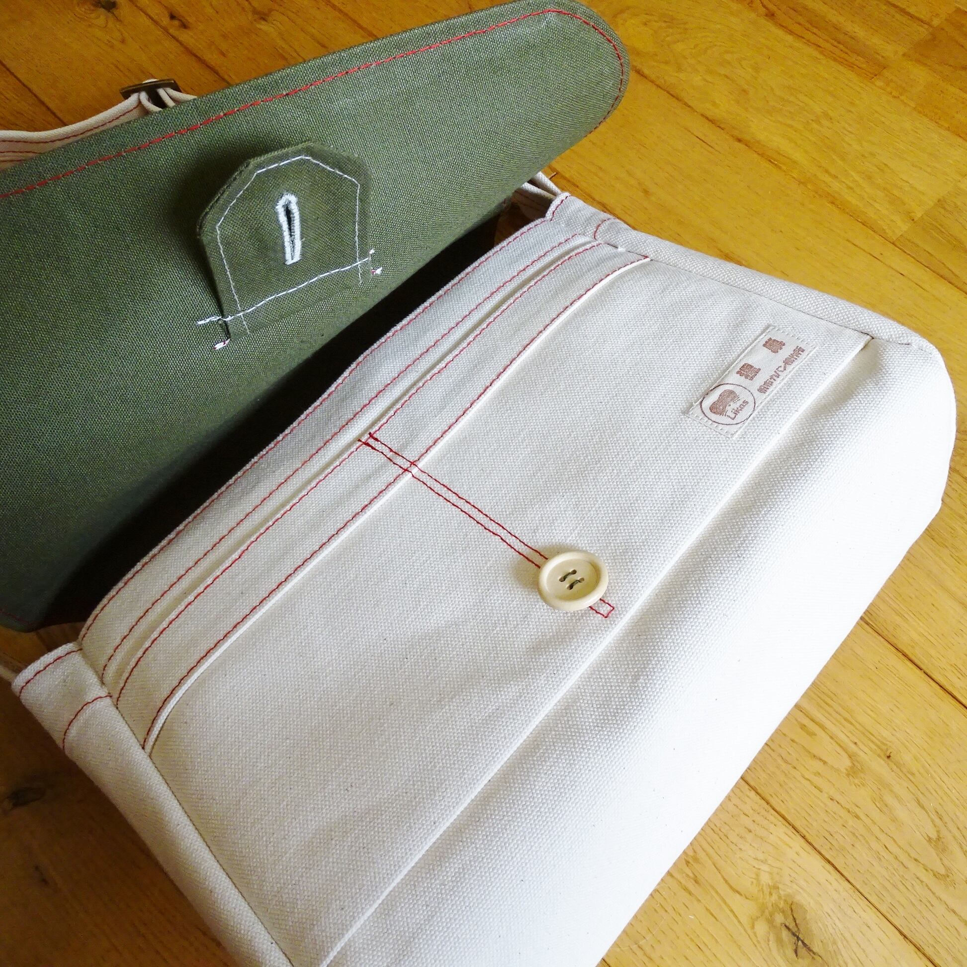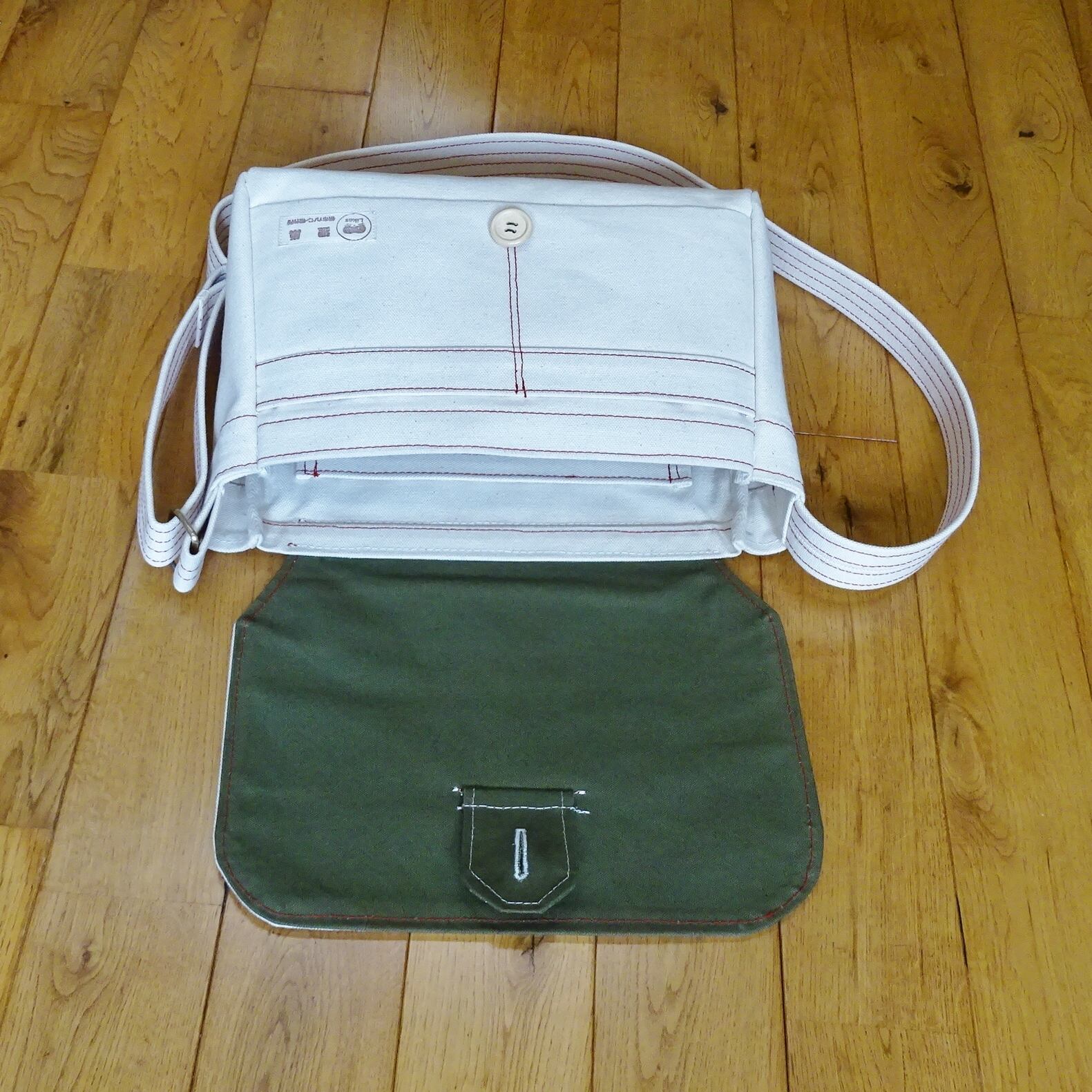 ■使用材:本体/フラップ/ストラップ 6号帆布生成り、フラップ裏 11号帆布 オリーブ色、縁テープ 綿綾テープ20mm生成り、縫糸 20番ポリエステルスパン糸、木製ボタン