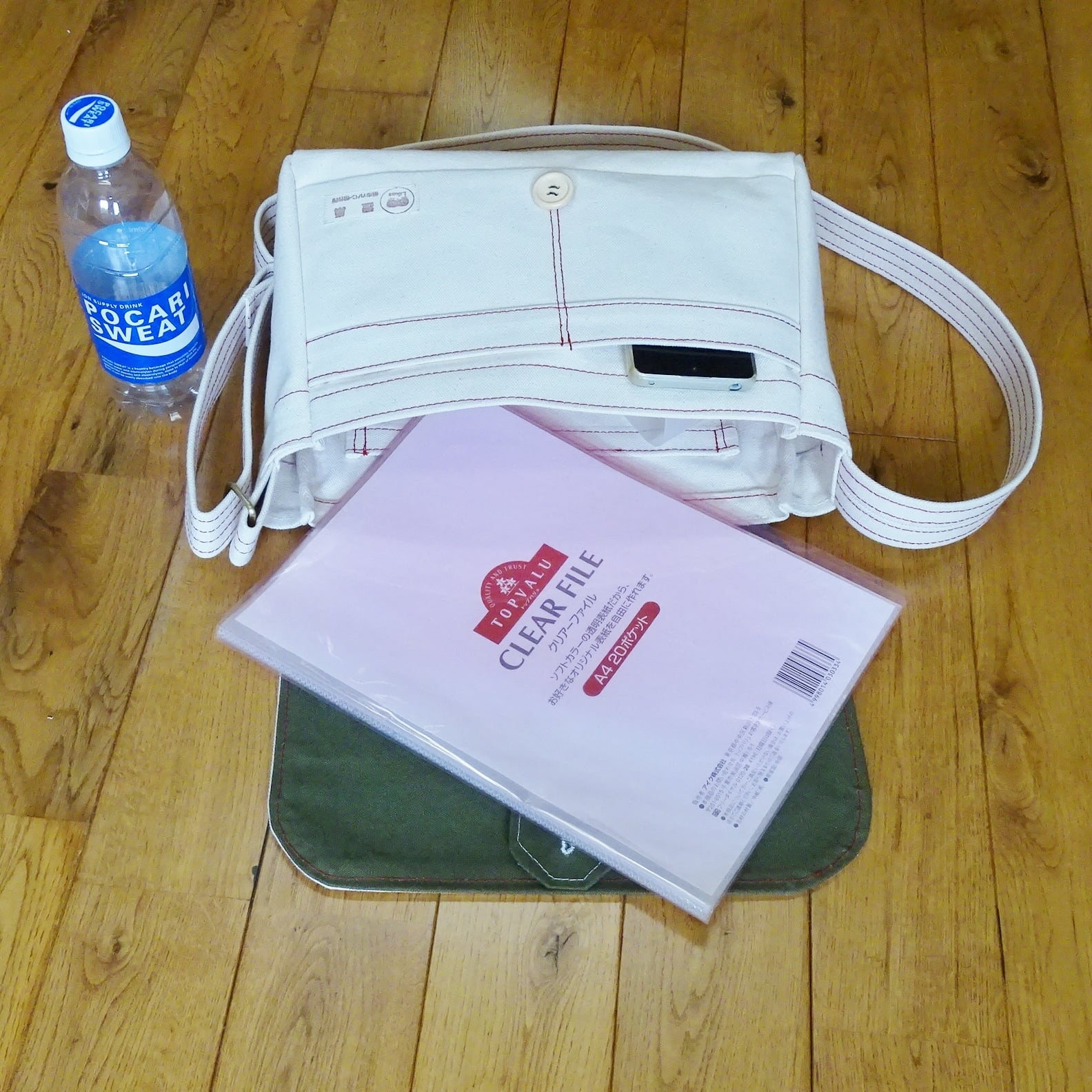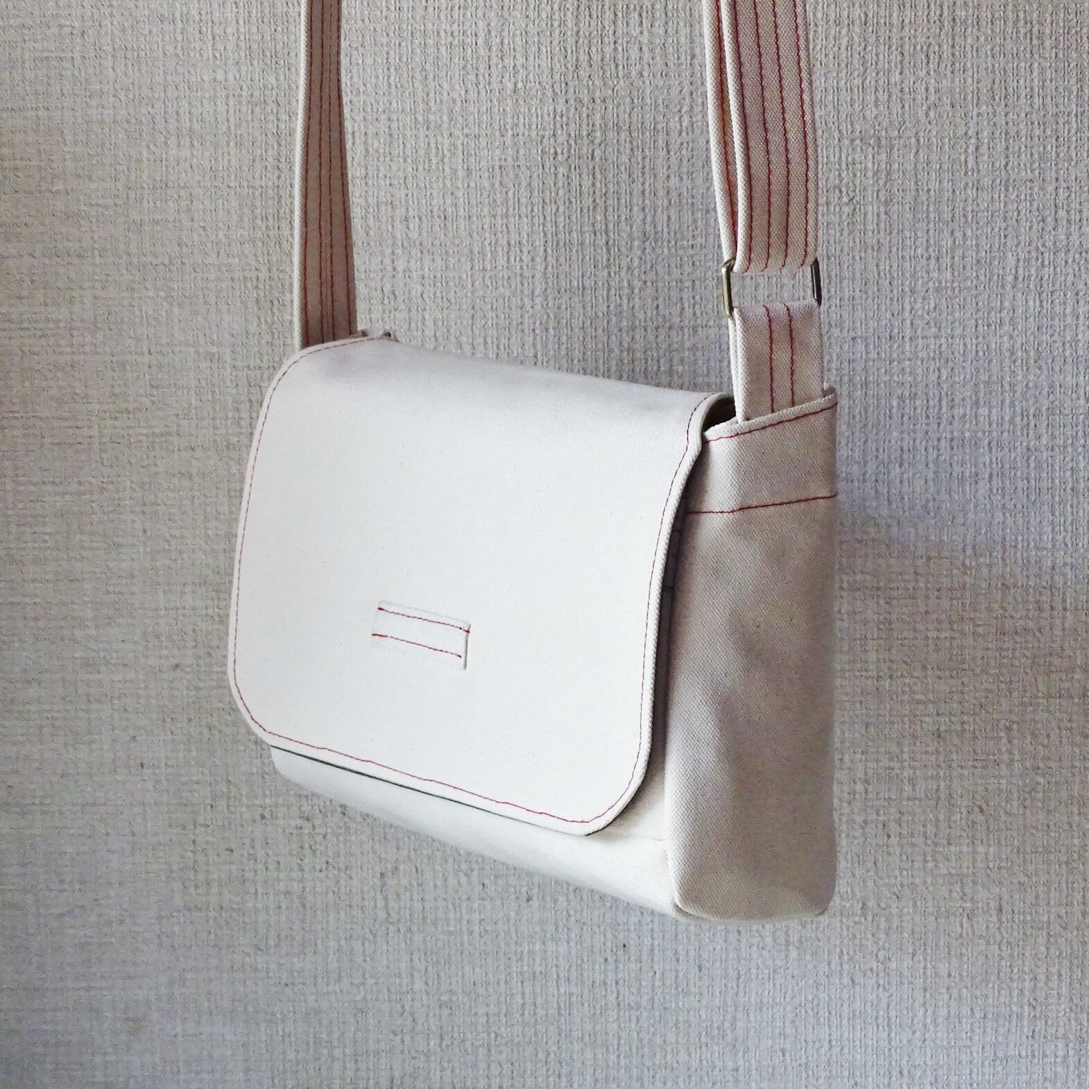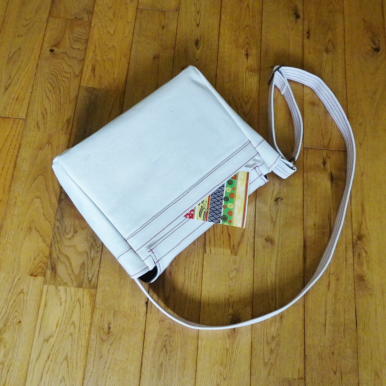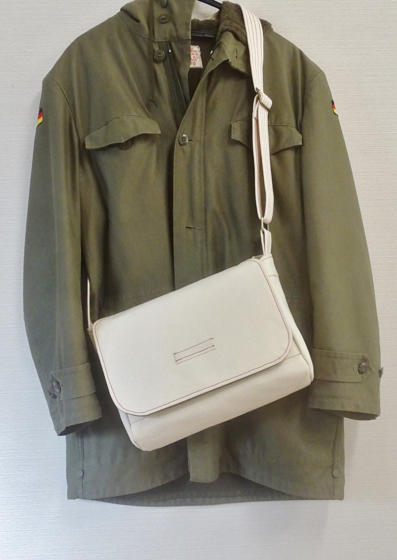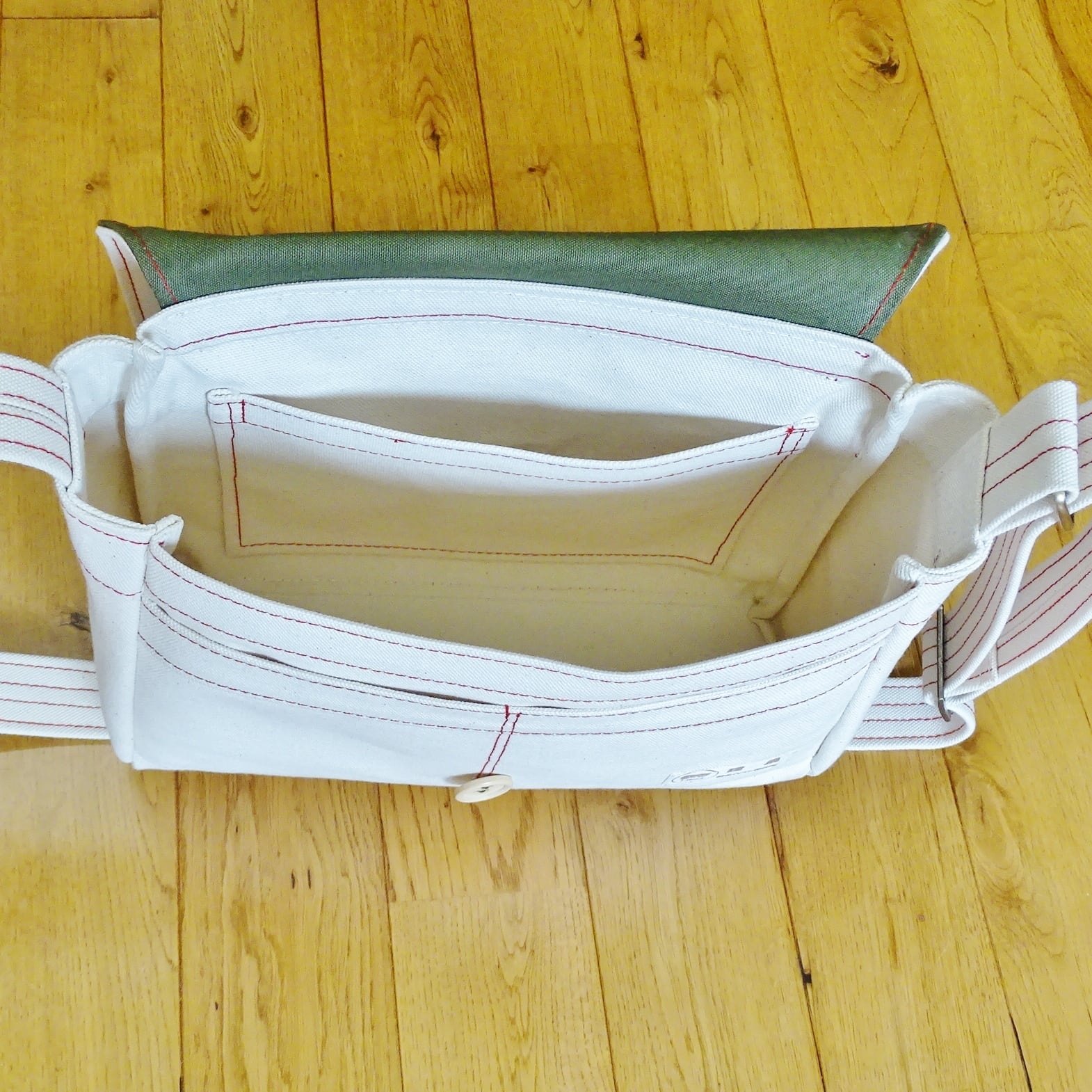 ■使用材:本体/フラップ/ストラップ 6号帆布生成り、フラップ裏 11号帆布 オリーブ色、縁テープ 綿綾テープ20mm生成り、縫糸 20番ポリエステルスパン糸、木製ボタン