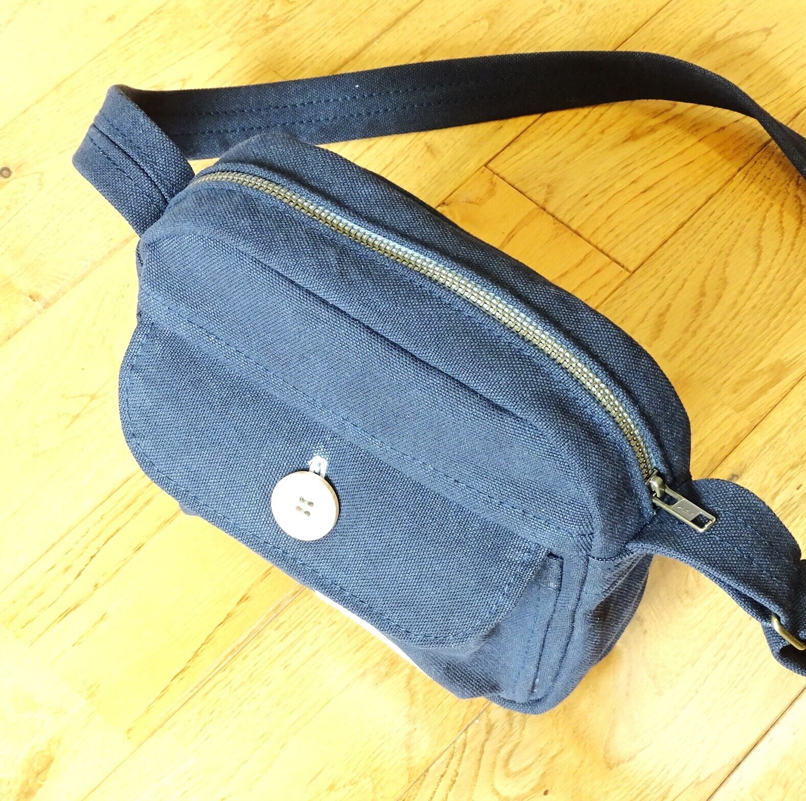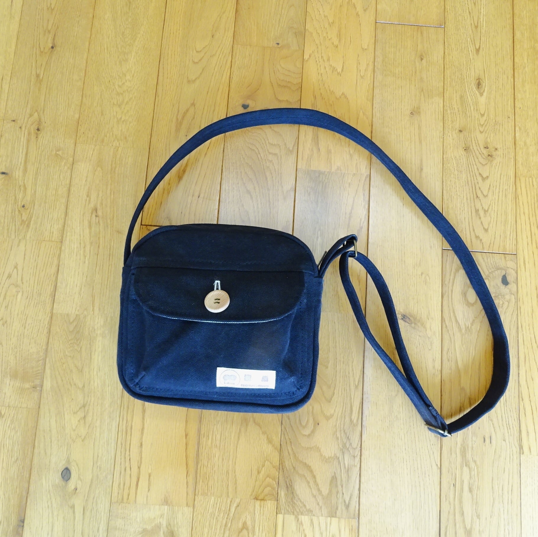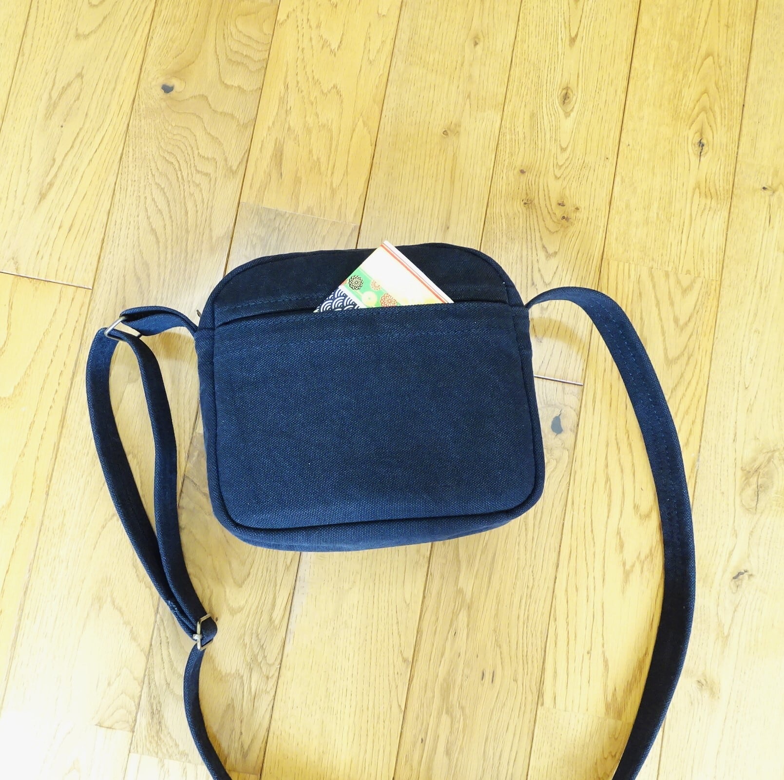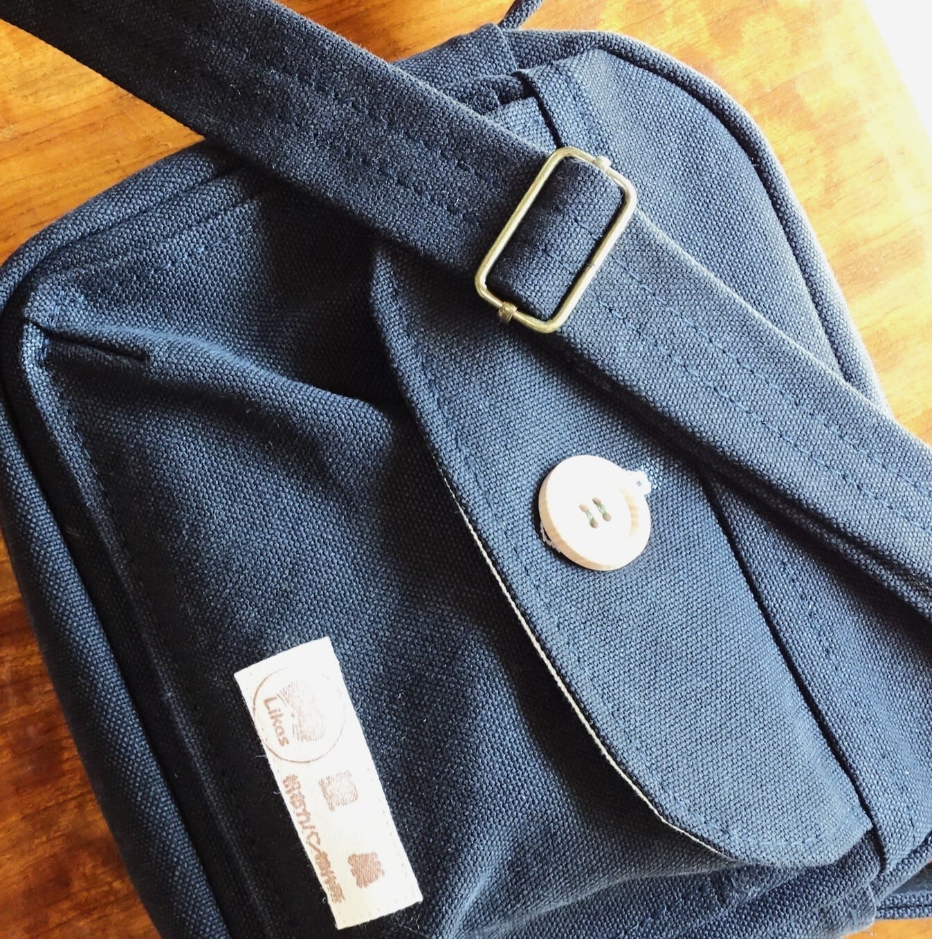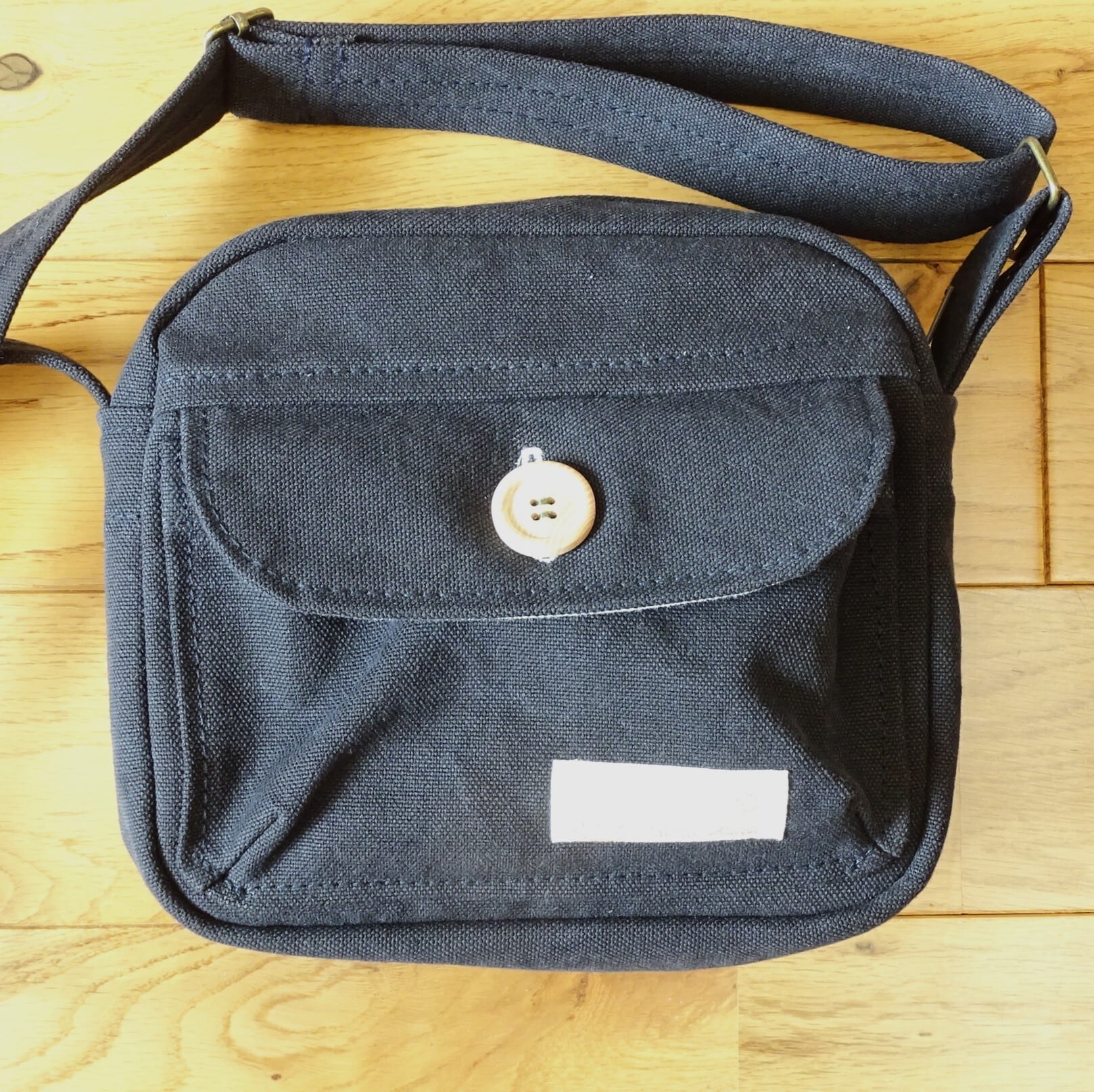 ■使用材:本体・ストラップ 8号帆布 黒、フラップ裏 11号帆布生成り、縁テープ 綿綾テープ20mm生成り、縫糸 20番ポリエステルスパン糸、金属ファスナーYKK5号、木製ボタン