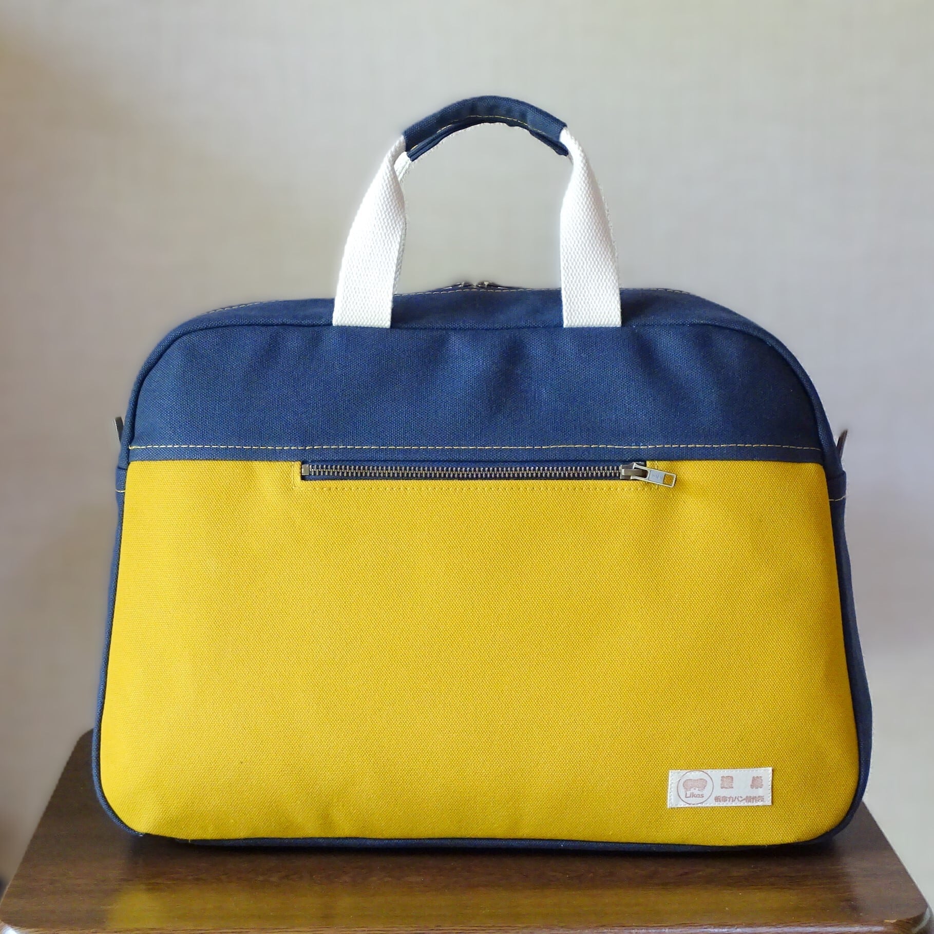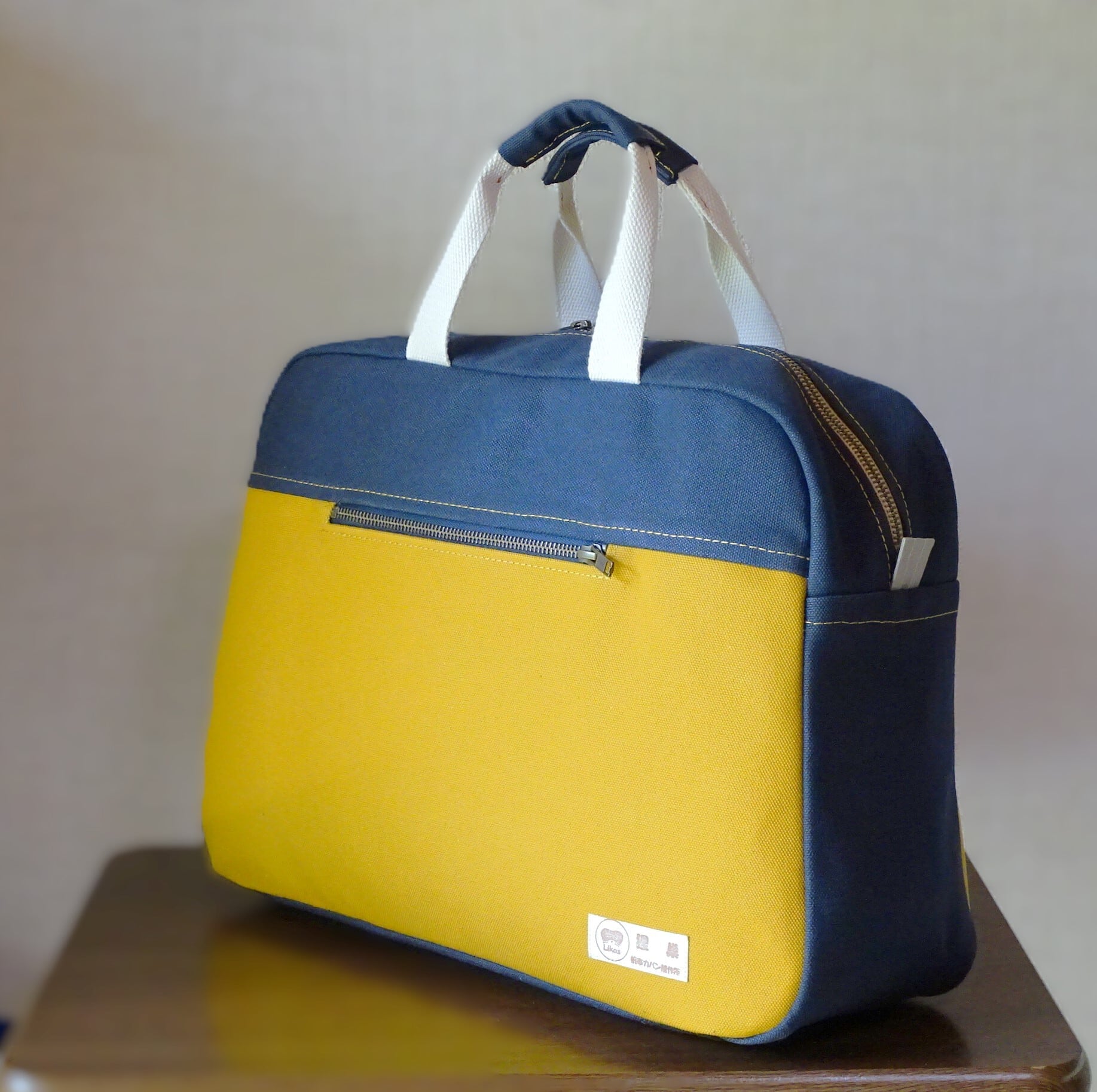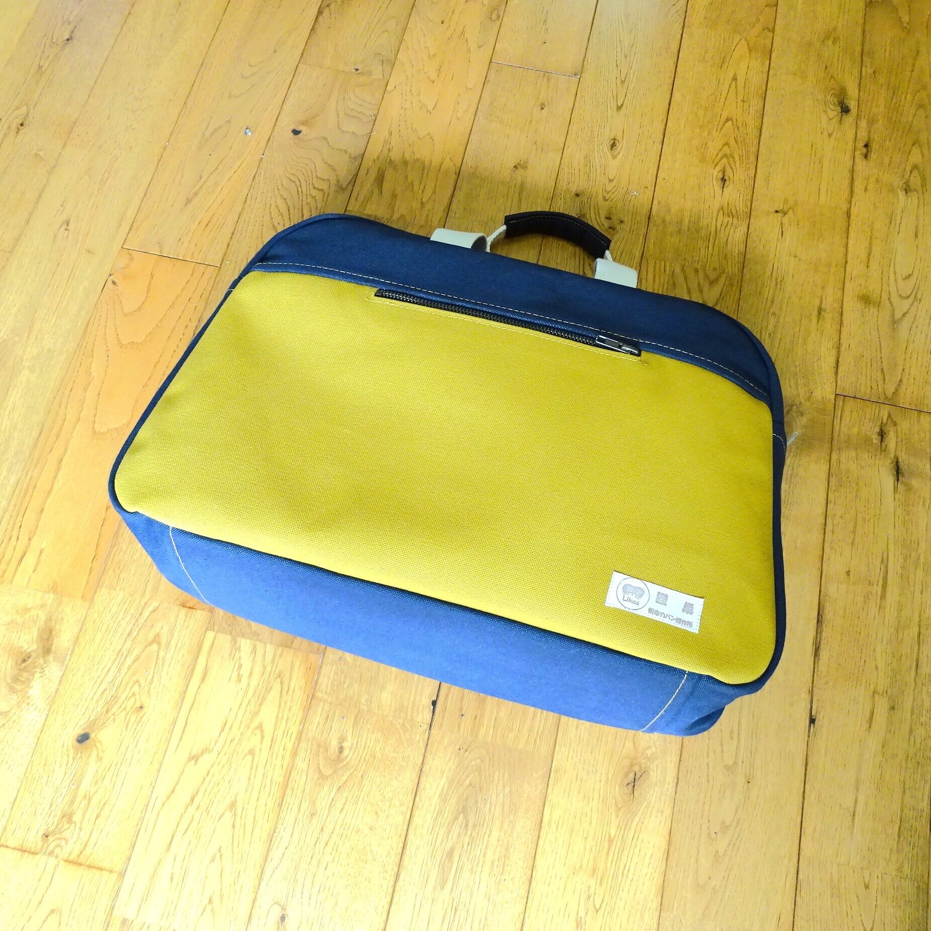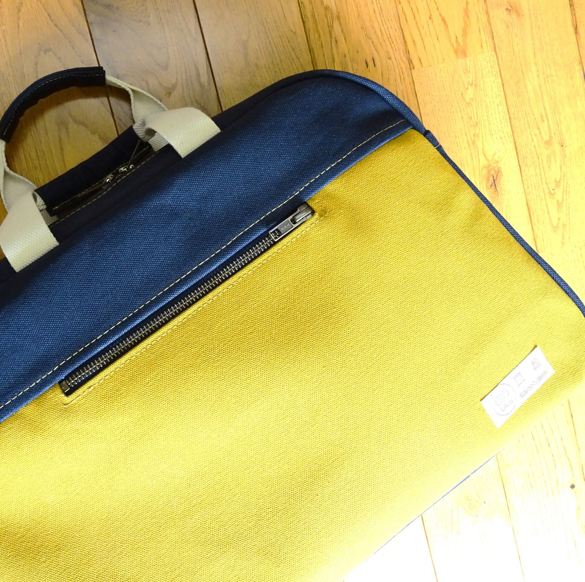■使用材:本体 8号帆布 マスタード/ネイビーブルー、内ポケット 11号帆布 生成り、持ち手 綿ポリ混織テープ 生成り、縁綿綾テープ20mm 生成り、縫糸 20番ポリエステルスパン糸、YKKメタルファスナー5号、底板 0.7mmt PP板