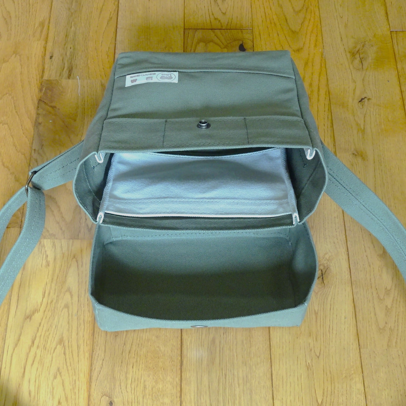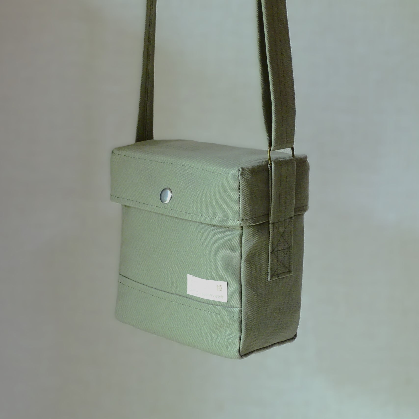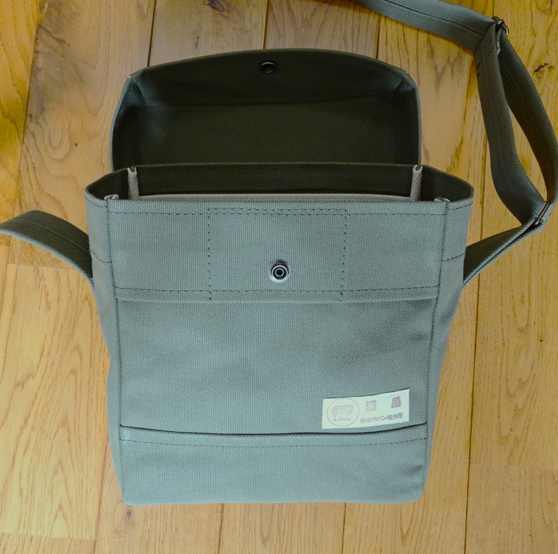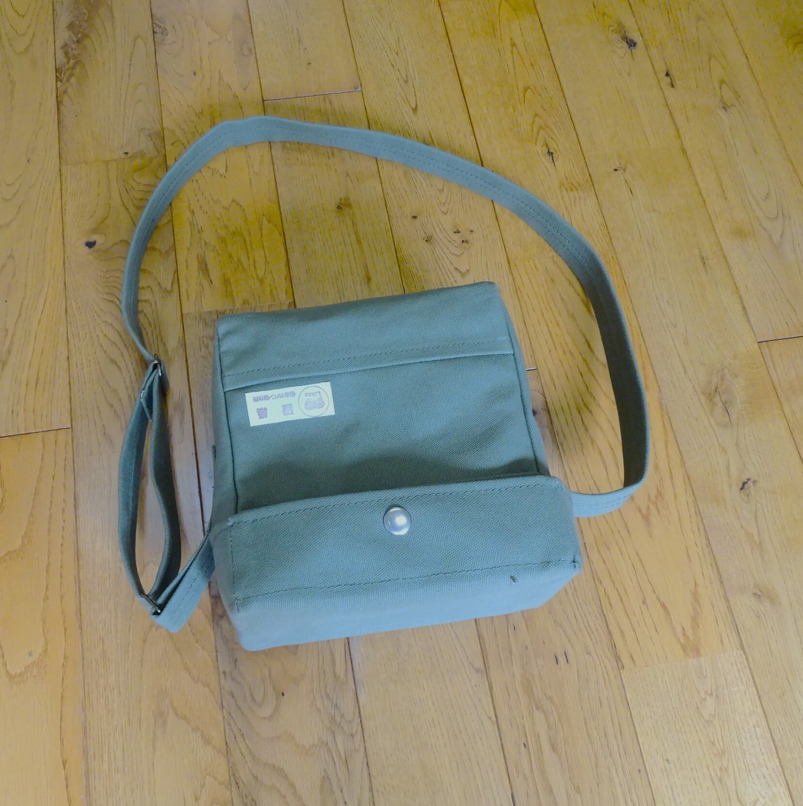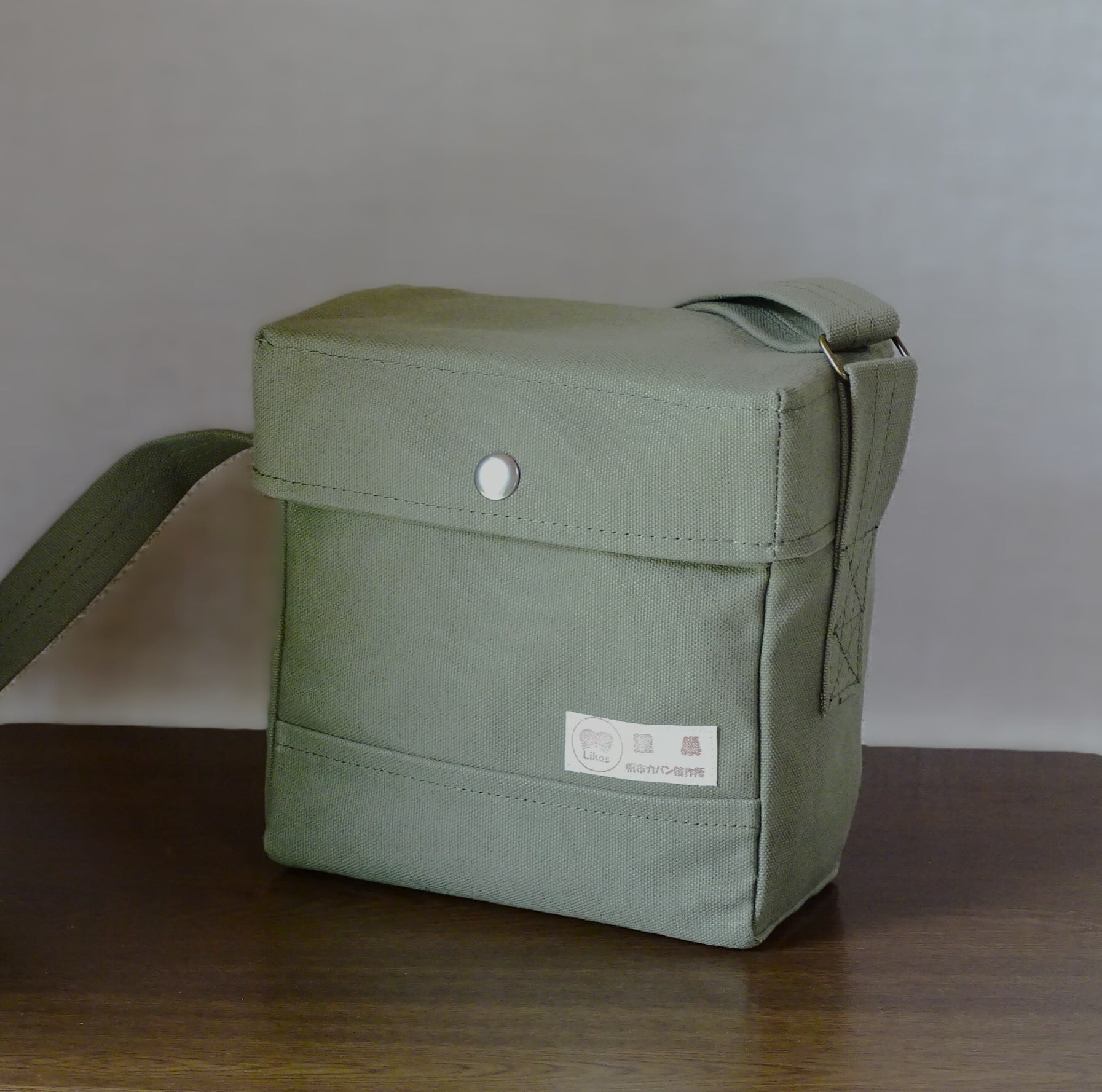 ■使用材:本体・ストラップ 8号帆布オリーブグレイ、縁綿綾テープ20mm生成り、縫糸 20番ポリエステルスパン糸、金属ジャンパーボタン